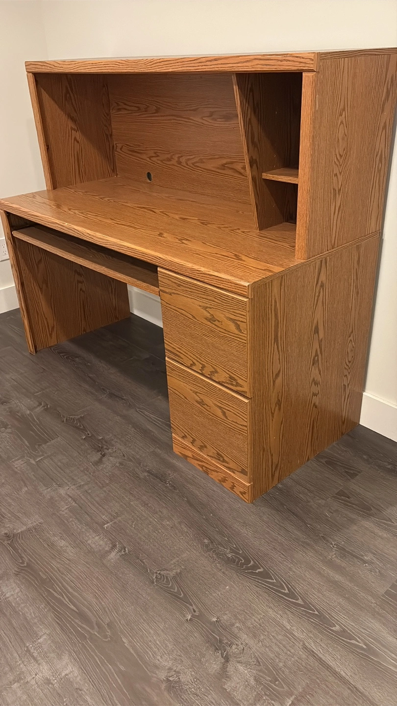 Selling a sturdy wooden desk with a hutch. It features a built-in keyboard tray and filing cabinet drawers for storage. Great for a home office or study space!