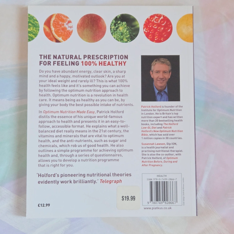 1000+Giving away 'Optimum Nutrition Made Easy' by Patrick Holford Perfect for anyone interested in learning more about healthy eating and lifestyle choices In great condition! Hoping the item finds a new home! From a smoke-free & pet-free home All exchanges are final; no refunds or reservations Pick-up only Location: Richmond Hill Serious inquries only; messaging only through Karrot Thank you for your interest & please check my 200+ listings for more!