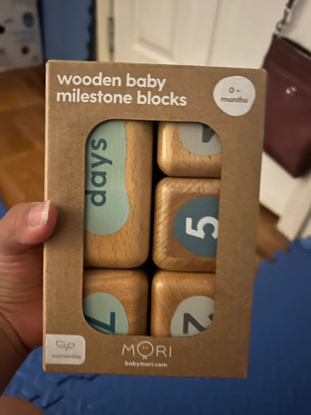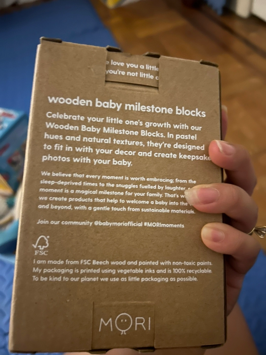 748Celebrate your little one's growth with these Mori Wooden Baby Milestone Blocks! They come in pastel hues and natural textures, designed to fit in with your decor and create keepsake photos with your baby. - Made from FSC Beech wood and painted with non-toxic paints - Packaging is printed using vegetable inks and is 100% recyclable - Suitable for 0+ months