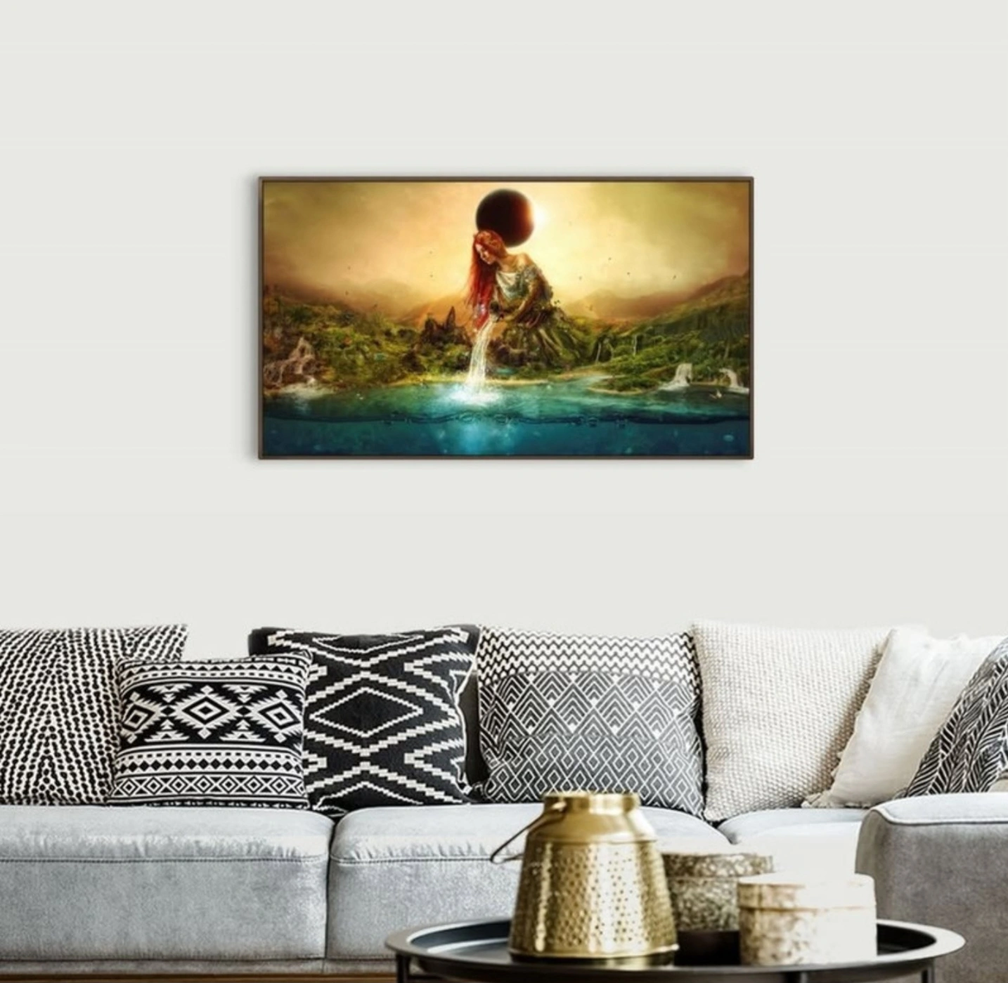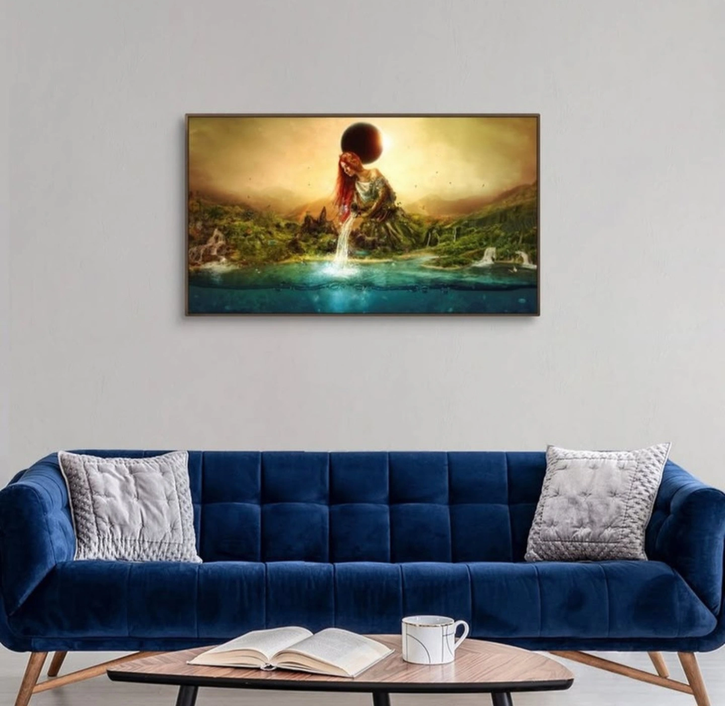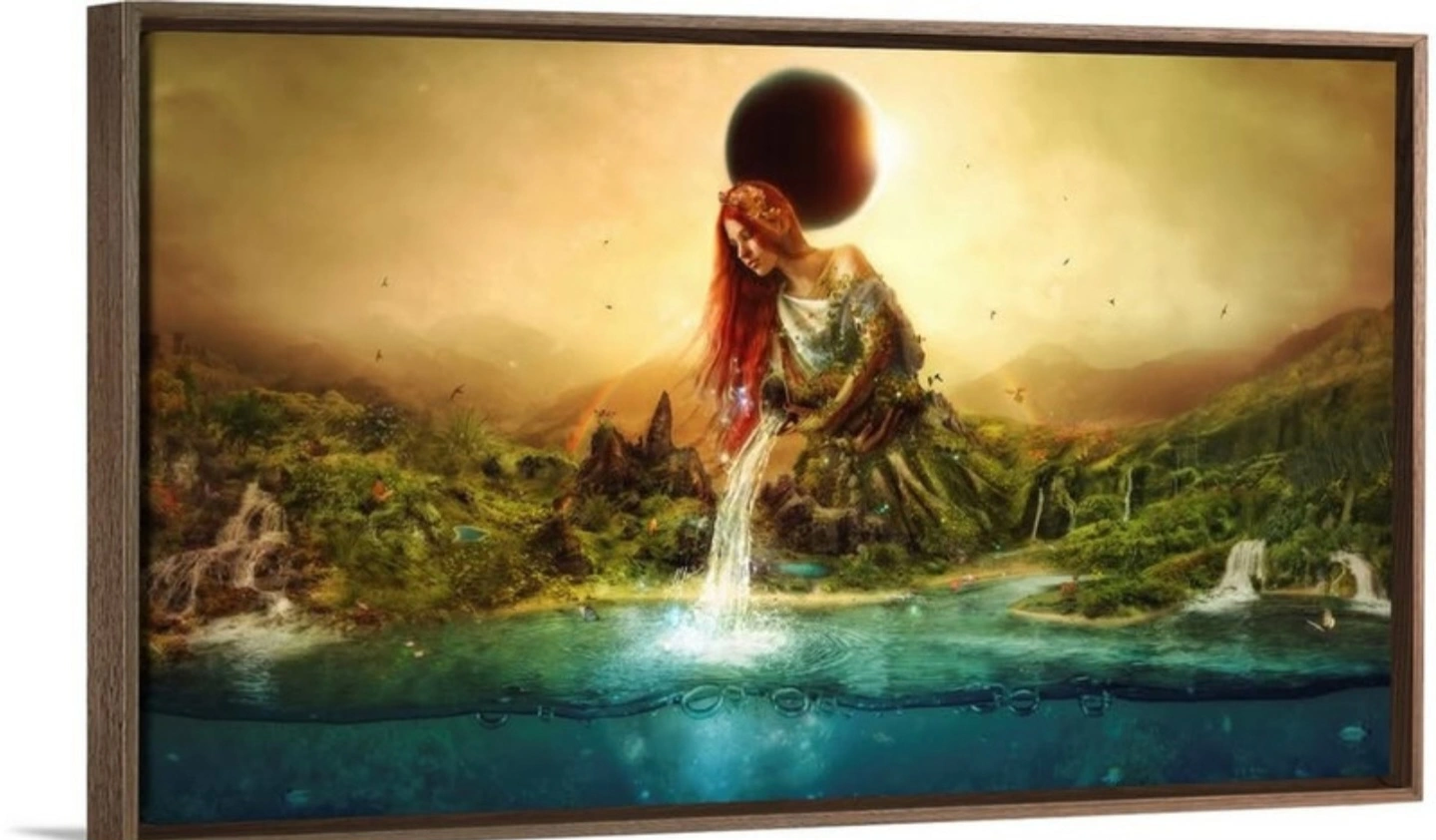 Stunning surrealist wall art by renowned Spanish illustrator Mario Sanchez Nevado, titled Fountain of Eternity. This bold and thought-provoking piece is printed on artist-grade canvas using fade-resistant archival inks and professionally mounted in a 2" deep modern floating frame. Measuring 49" wide by 28" high, it makes an impactful centerpiece for any space. Hand-assembled in the USA with solid wood construction and pre-installed hanging hardware for easy mounting. The colors are vibrant, the detail is sharp, and the mood is unforgettable – exactly what you’d expect from Mario’s signature dreamlike aesthetic.