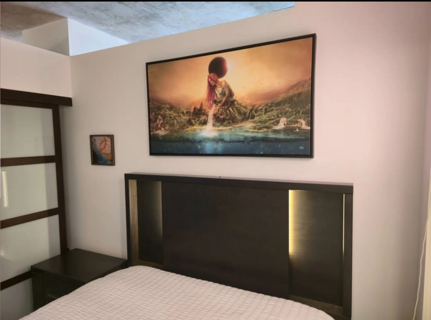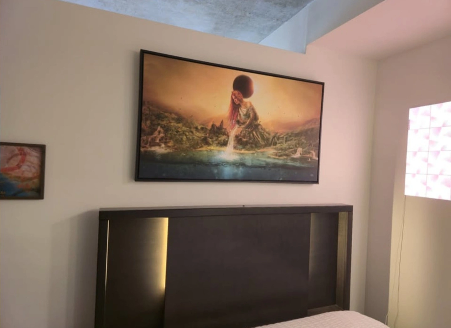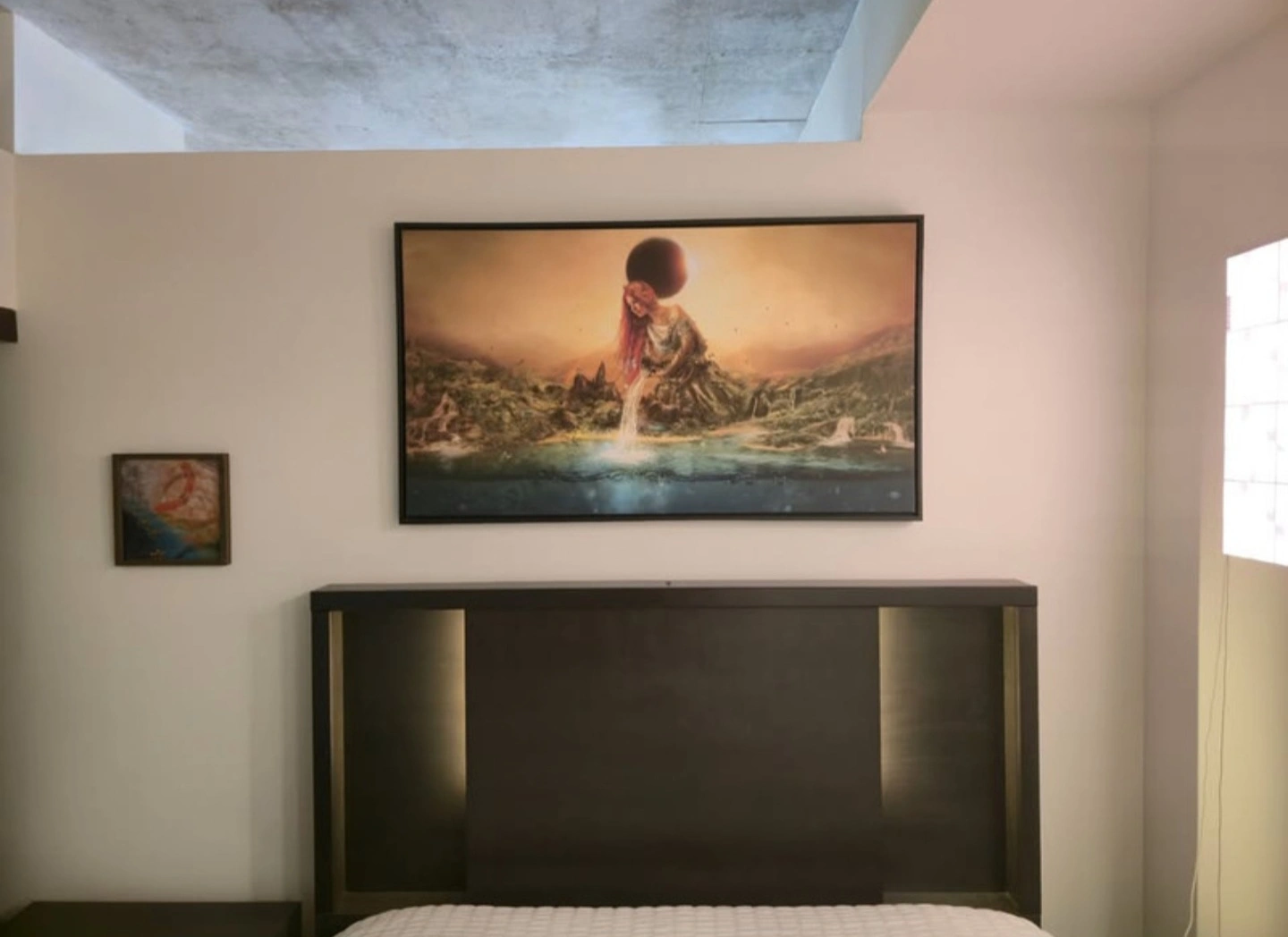 Stunning surrealist wall art by renowned Spanish illustrator Mario Sanchez Nevado, titled Fountain of Eternity. This bold and thought-provoking piece is printed on artist-grade canvas using fade-resistant archival inks and professionally mounted in a 2" deep modern floating frame. Measuring 49" wide by 28" high, it makes an impactful centerpiece for any space. Hand-assembled in the USA with solid wood construction and pre-installed hanging hardware for easy mounting. The colors are vibrant, the detail is sharp, and the mood is unforgettable – exactly what you’d expect from Mario’s signature dreamlike aesthetic.