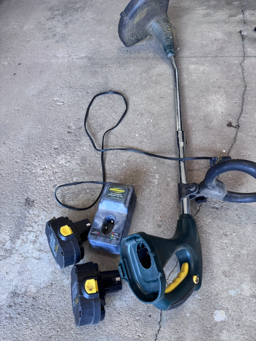 Selling a Yardworks cordless grass trimmer. It comes with a charger and two batteries so you'll be ready to tackle the lawn. Great for keeping your yard tidy!