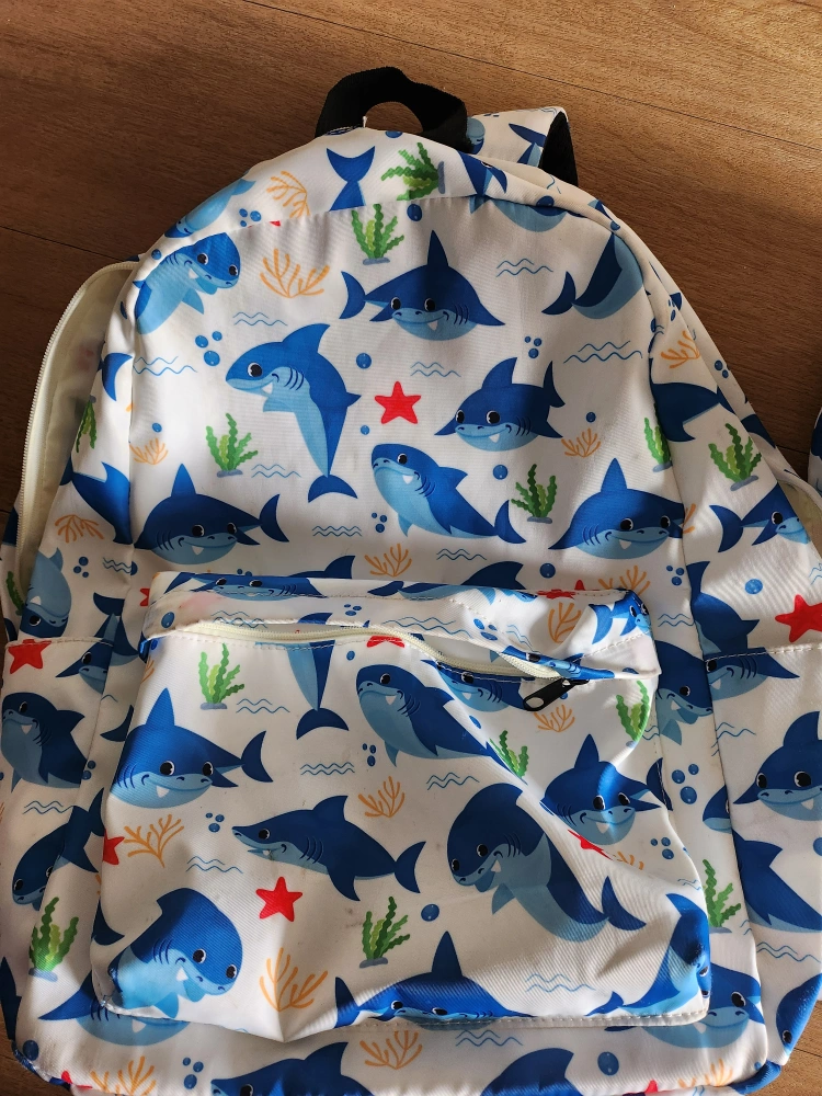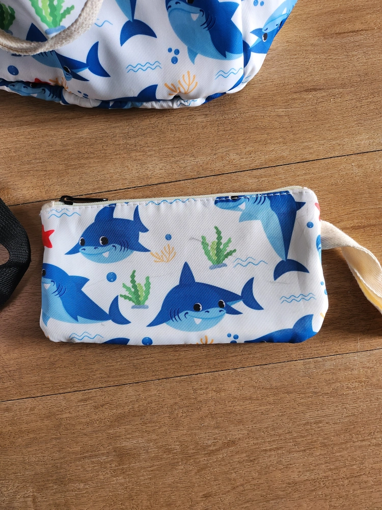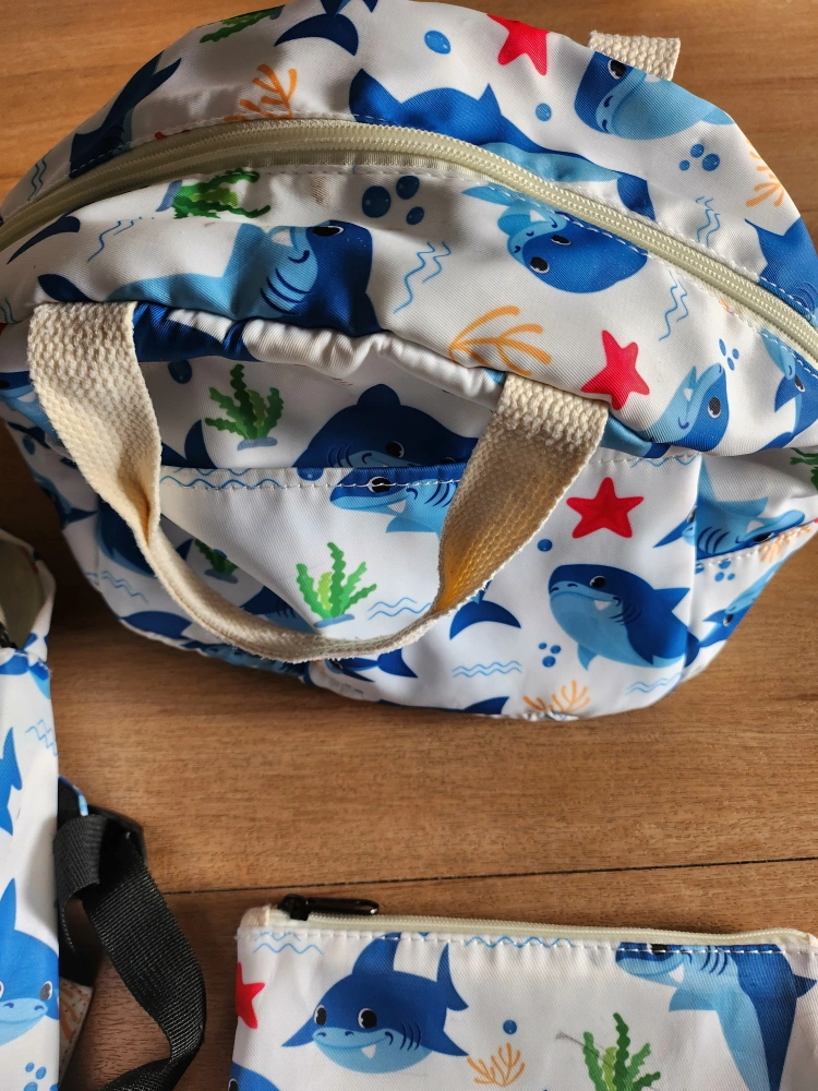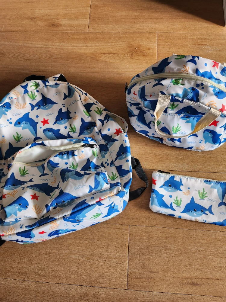 A cute matching set for your little one! Includes a backpack, lunch bag, and pencil case, all with a fun shark print. Perfect for school or daycare