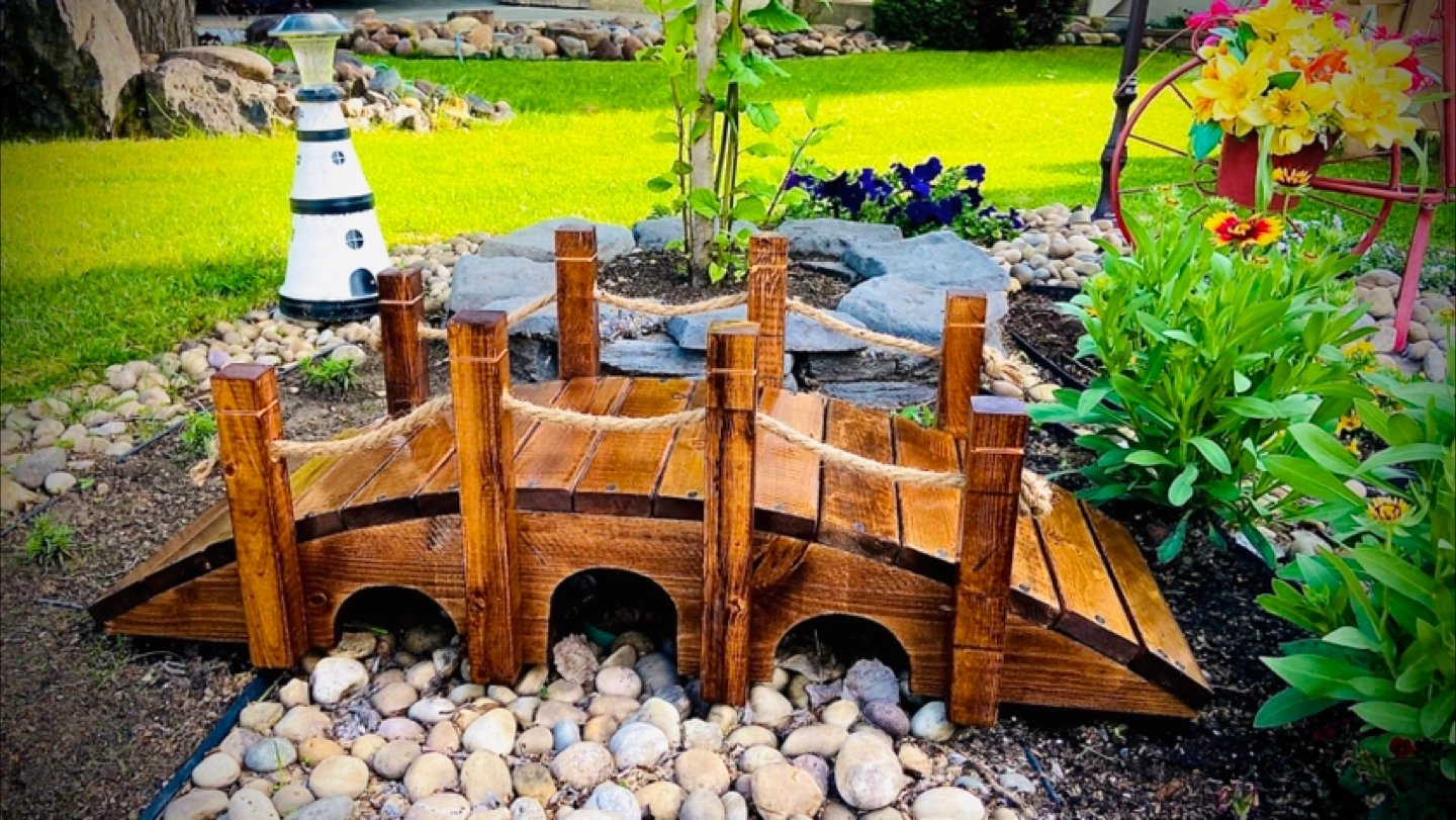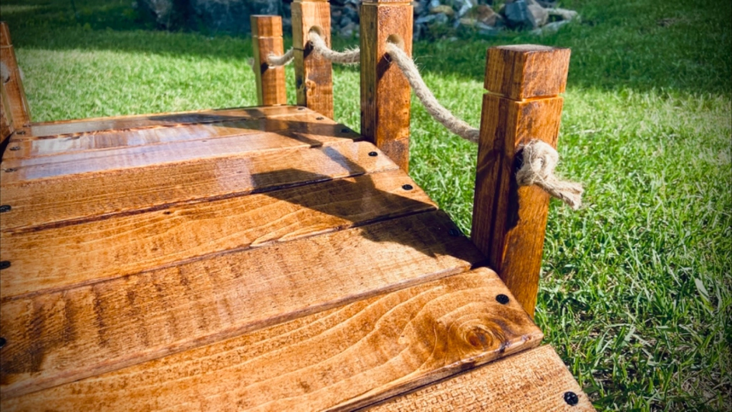 This is a new, custom made, one-of-a-kind decorative garden bridge made with locally sourced wood. Made in a home workshop, the bridge is solidly built, in a beautiful red mahogany finish, and double coated with an oil based finish for outdoor weather. The bridge features three tunnels and eight pillars linked with nautical rope. It makes a beautiful and unique addition to a lawn or garden. The bridge is 36” long by 15” wide.