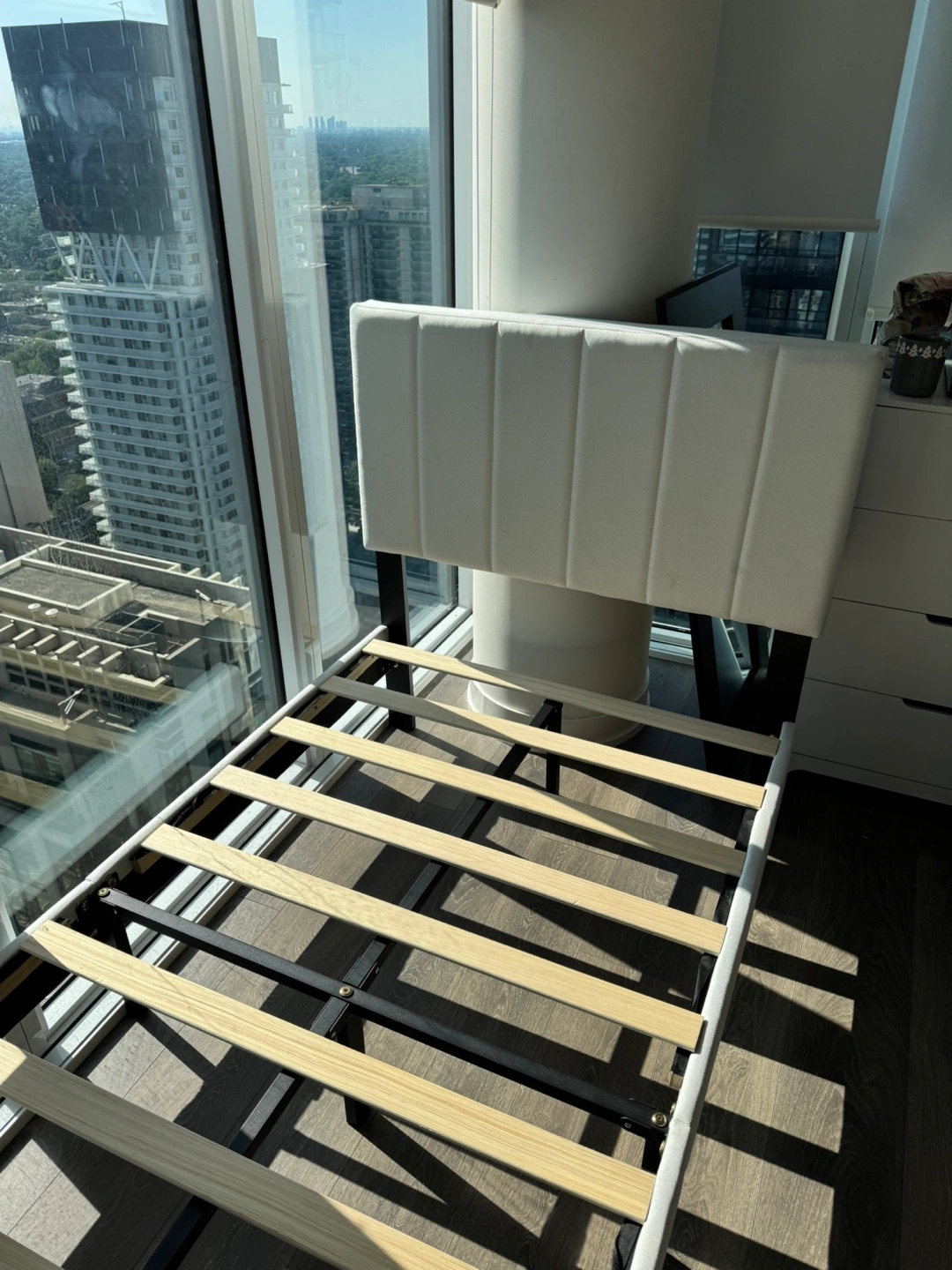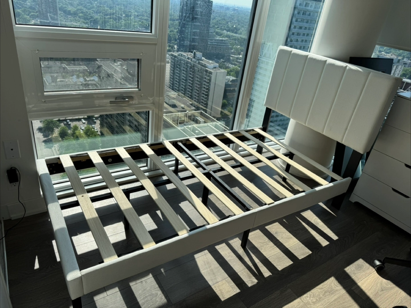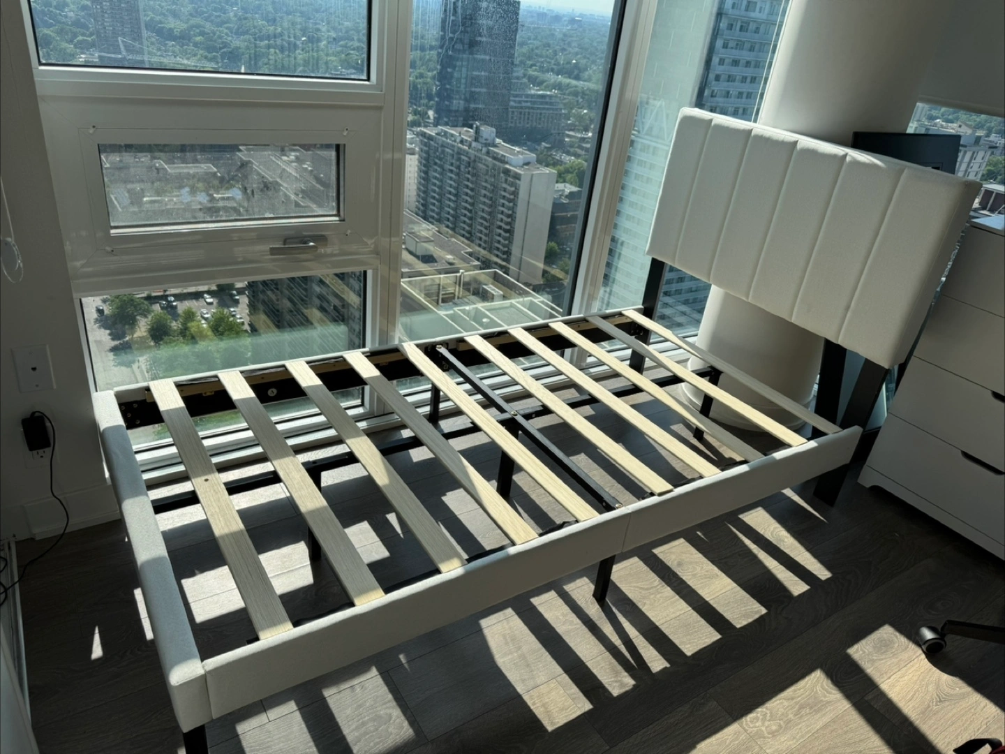 Selling a bed frame with a white upholstered headboard. It's in great condition and ready for a new home!