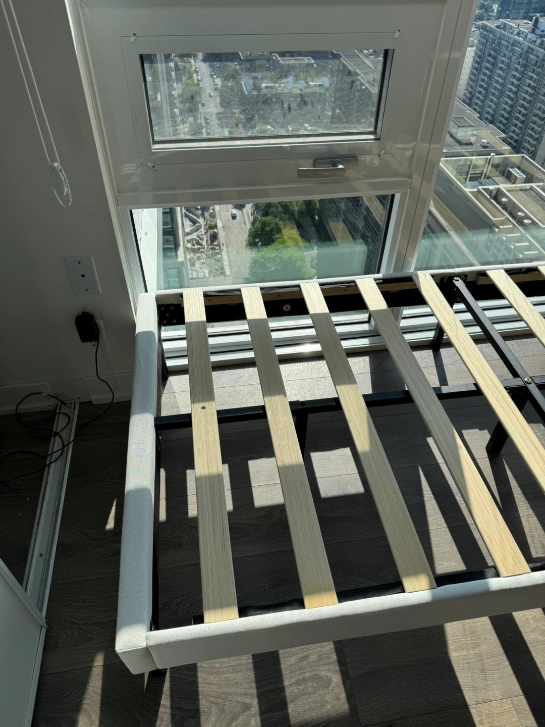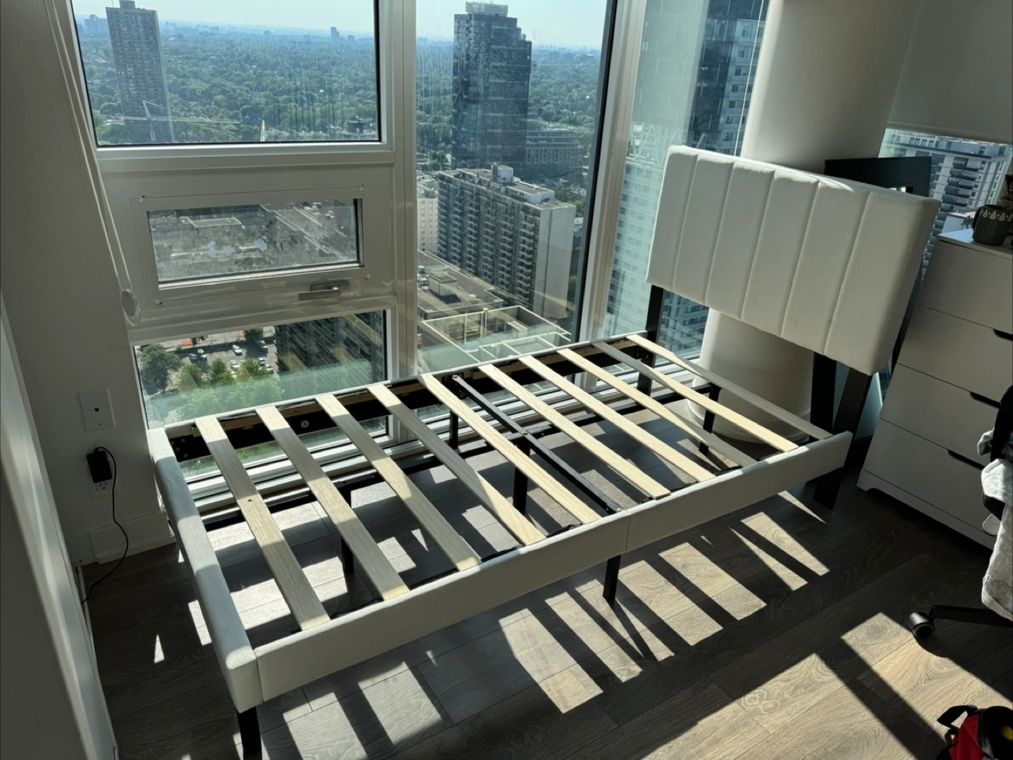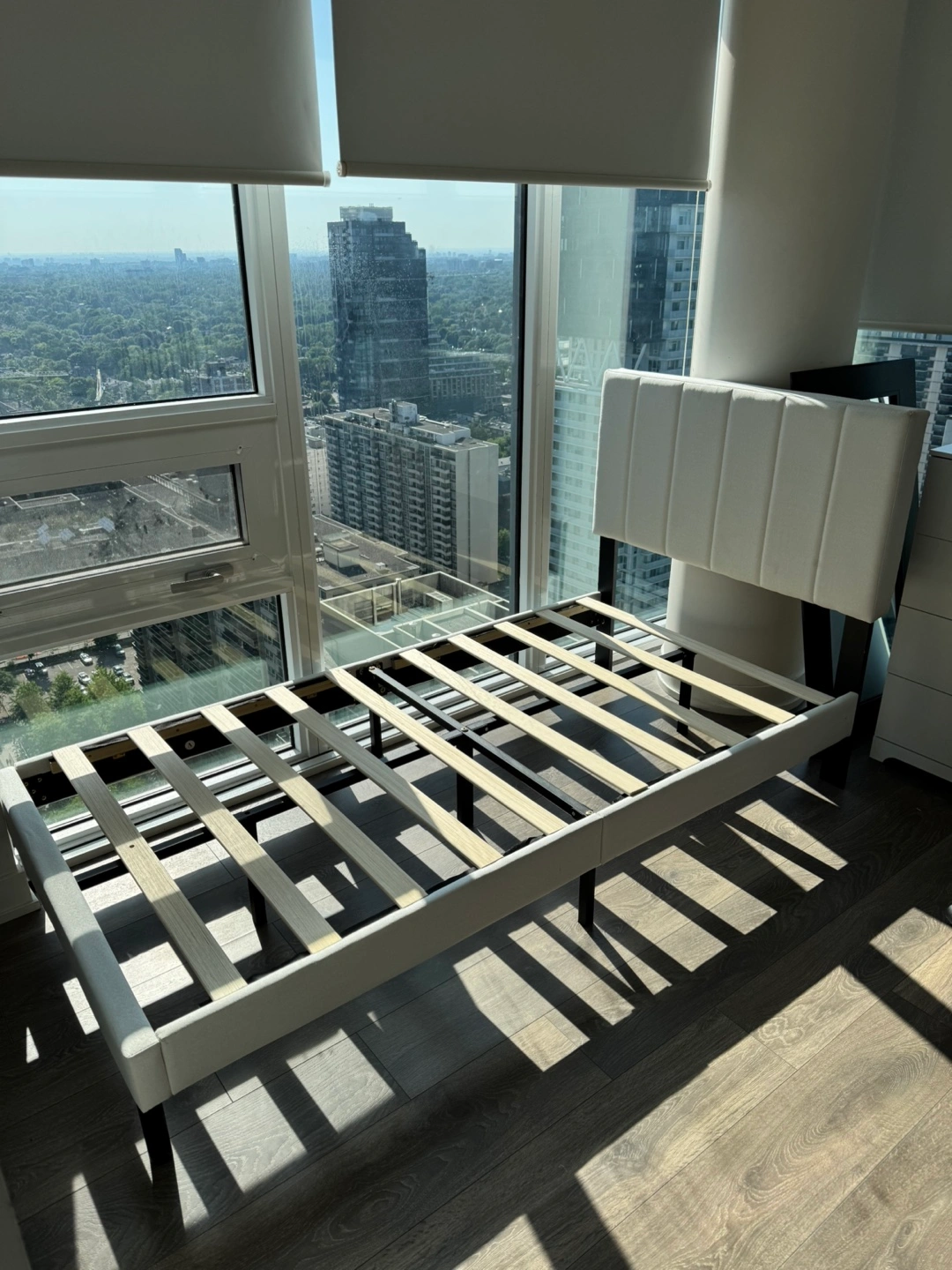Selling a bed frame with a white upholstered headboard. It's in great condition and ready for a new home!