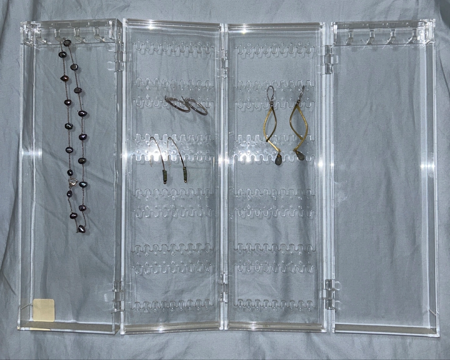 This is a NEW acrylic 4-panel earring and necklace holder from The Container Store (jewelry just for display and not included). It's perfect for organizing dozens of earrings and necklaces. Folds to keep them dust-free and to take up little space. Originally bought for $24.99. Never used. Closed, measures 12x4 ”. Opens to 17”. Has dozens of hooks for necklaces and earrings.