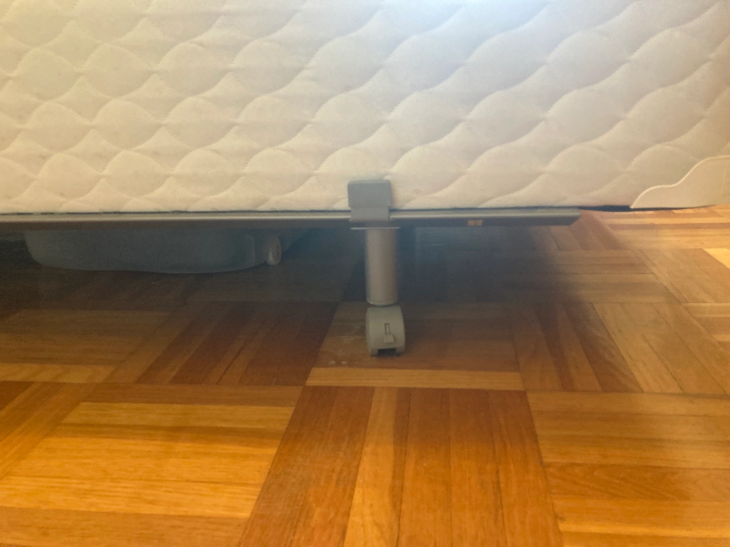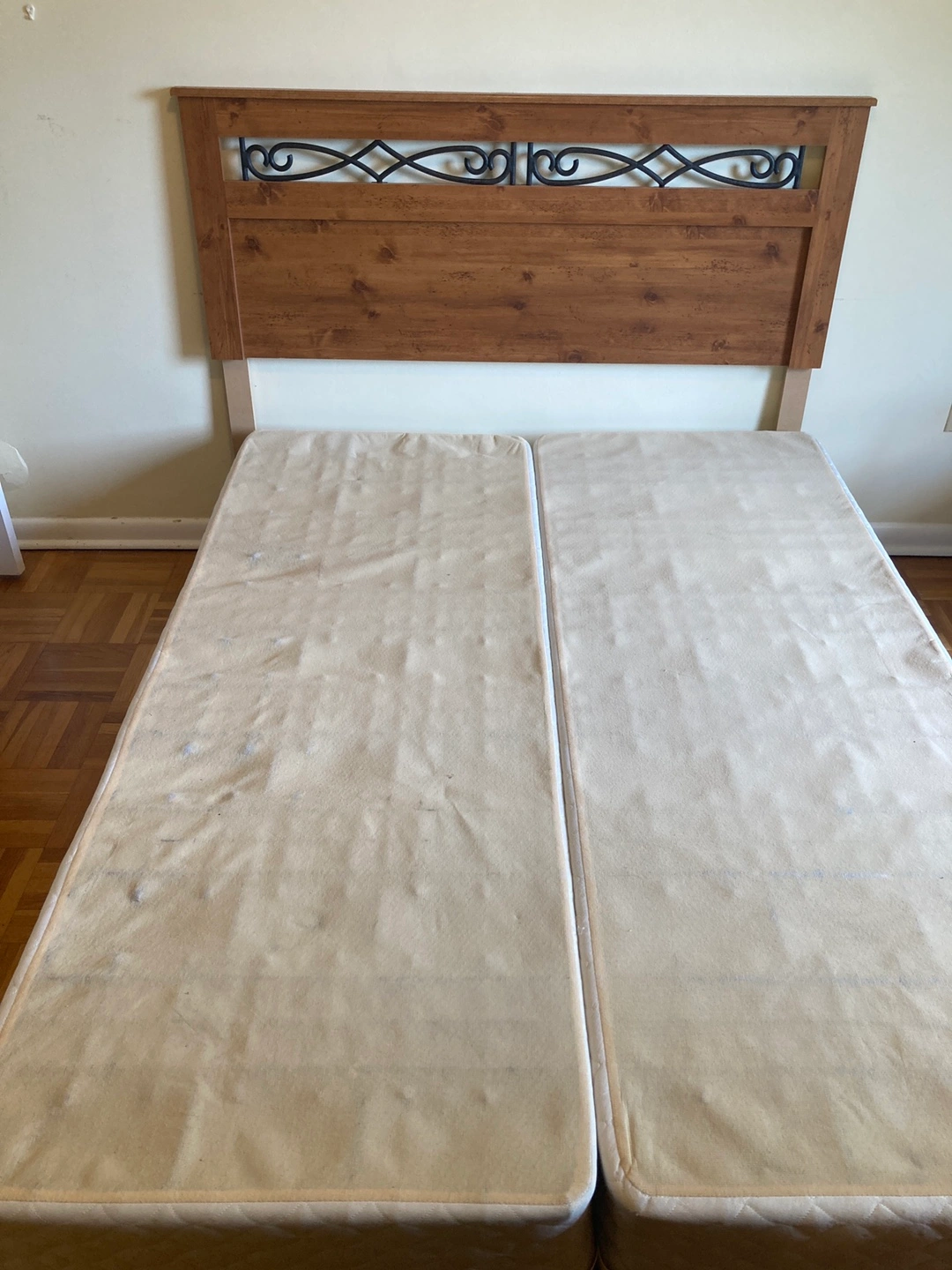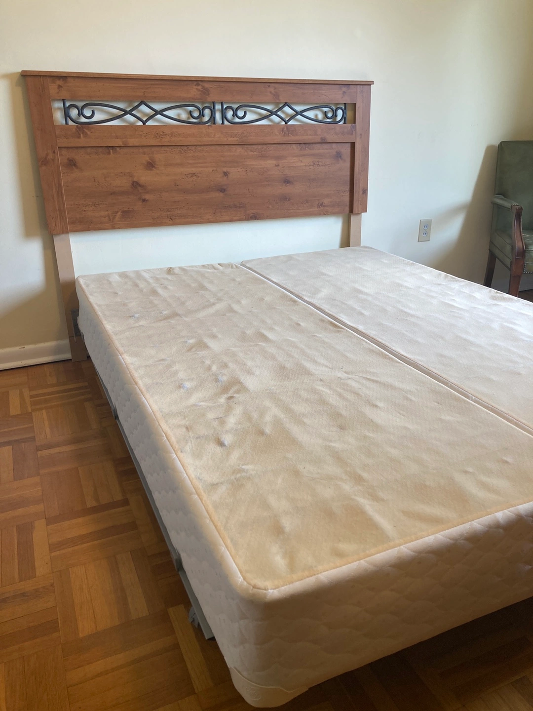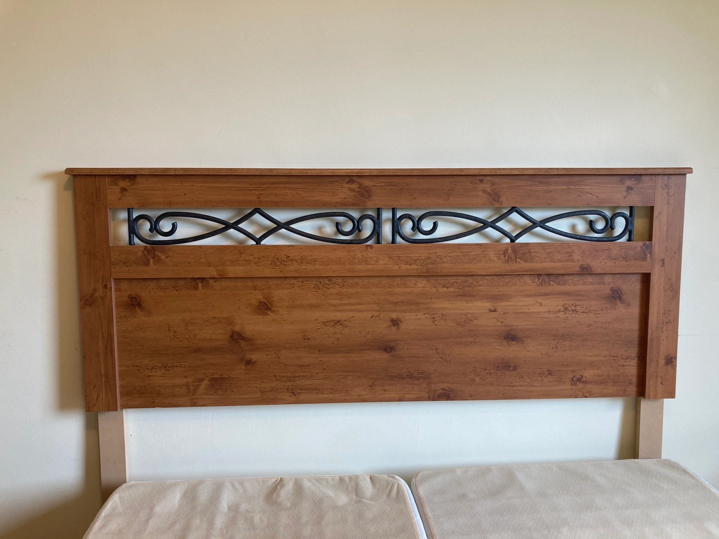 Selling a wooden headboard with a decorative metal design and a matching bed frame. Fits approximately a double Queen mattress. It's a sturdy set that would look great in any bedroom. The bed frame includes a support system with wheels for easy moving.