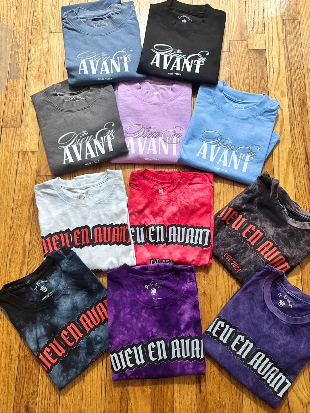 I have a variety of Dieu En Avant t-shirts and tote bags available. The shirts come in different colors and designs. The tote bags are also available in different sizes and styles. Check out the pictures and let me know if you're interested!
