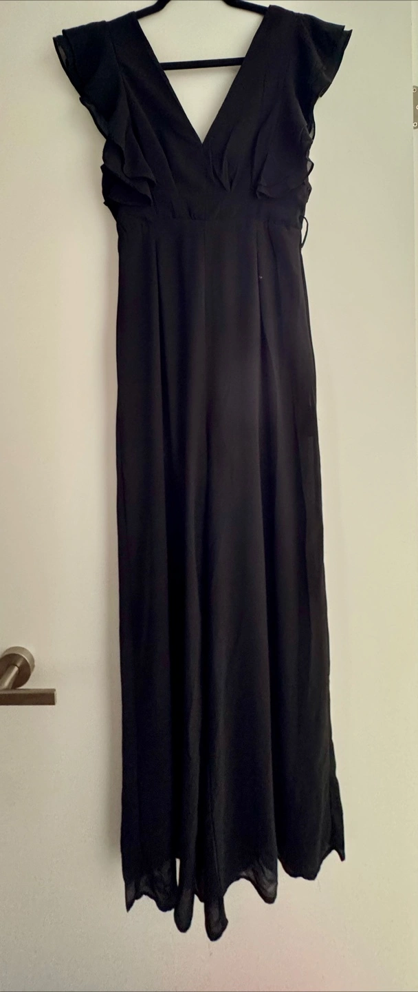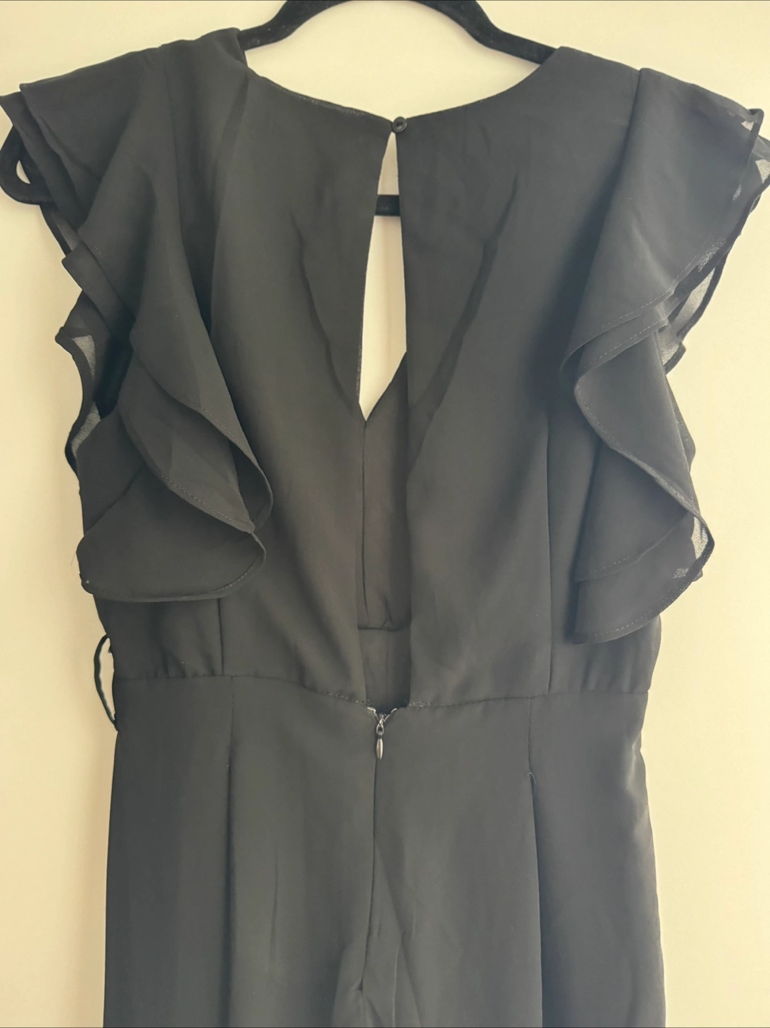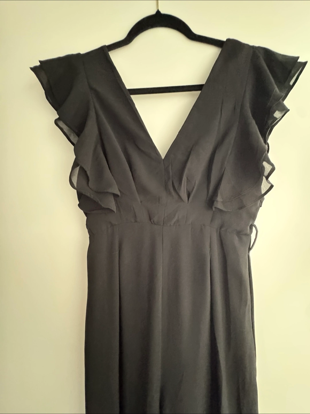 Selling a stylish black jumpsuit with ruffle sleeves. It's in great condition and ready for a new home. Perfect for dressing up for a summer party.