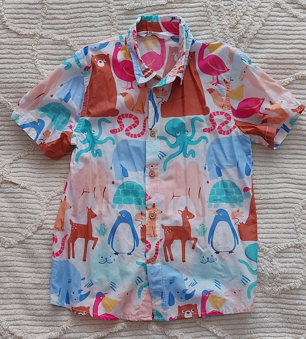 Here's a cute H&M button-up shirt for kids! It's a size 6-7 and features a colourful animal print all over. Perfect for your little one's wardrobe! Very thin and perfect for summer.