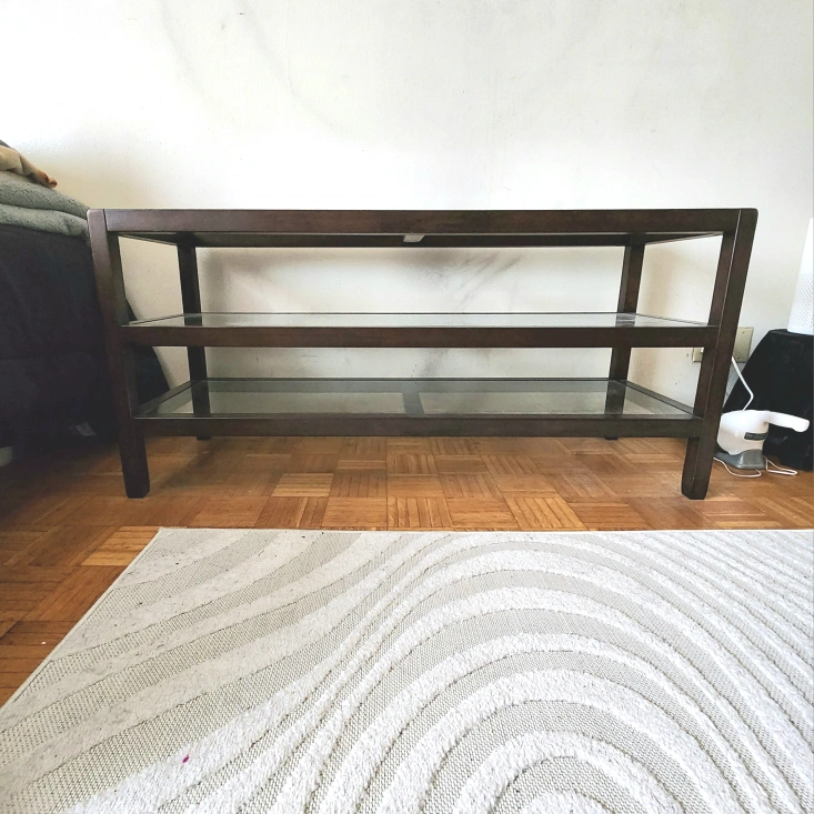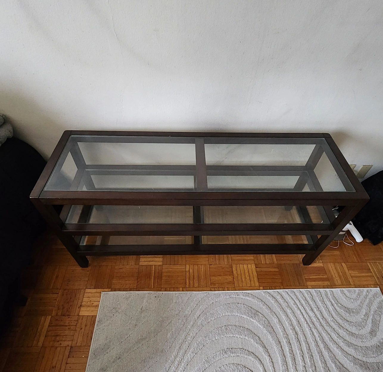 Giving away a brown wooden TV stand with a glass top and shelves. It's in good condition and would be great for any living room.