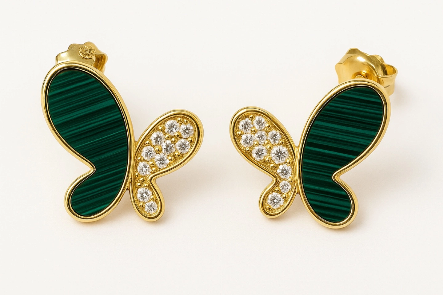 610925 Sterling Silver Butterfly Earrings with Green Malachite & Crystal Wings – Handmade Style”