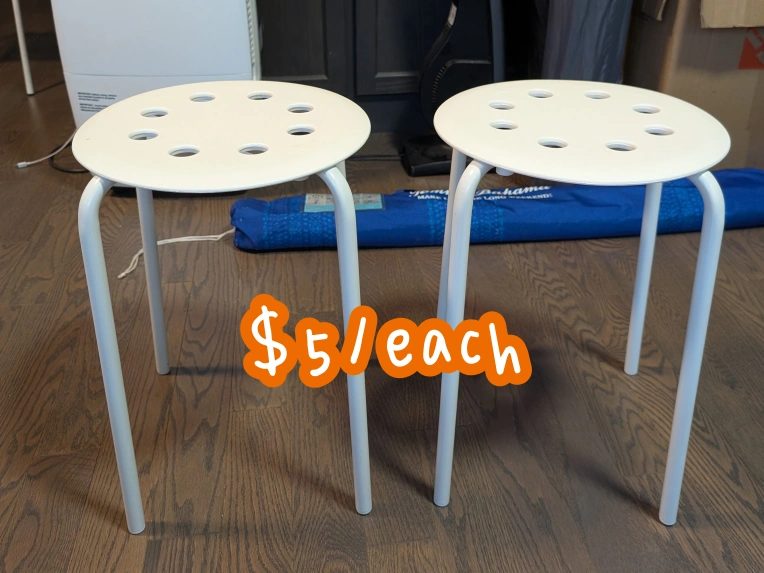 Selling these simple white stools! They're perfect for adding extra seating around the house or for a quick perch. They're sturdy and clean, ready for a new home