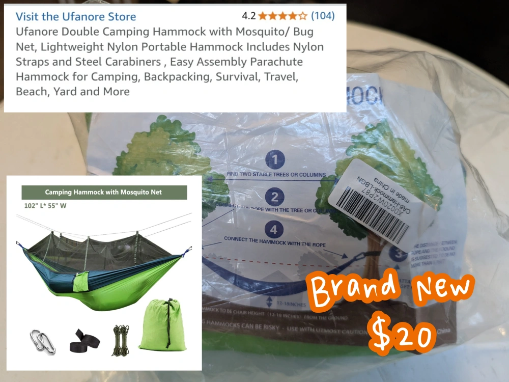 Selling a brand new Ufanore double camping hammock! It comes with a mosquito/bug net, nylon straps, and steel carabiners. It's lightweight and portable, perfect for camping, backpacking, survival, travel, beach, or yard use. The hammock is easy to assemble and measures 102" L x 55" W.