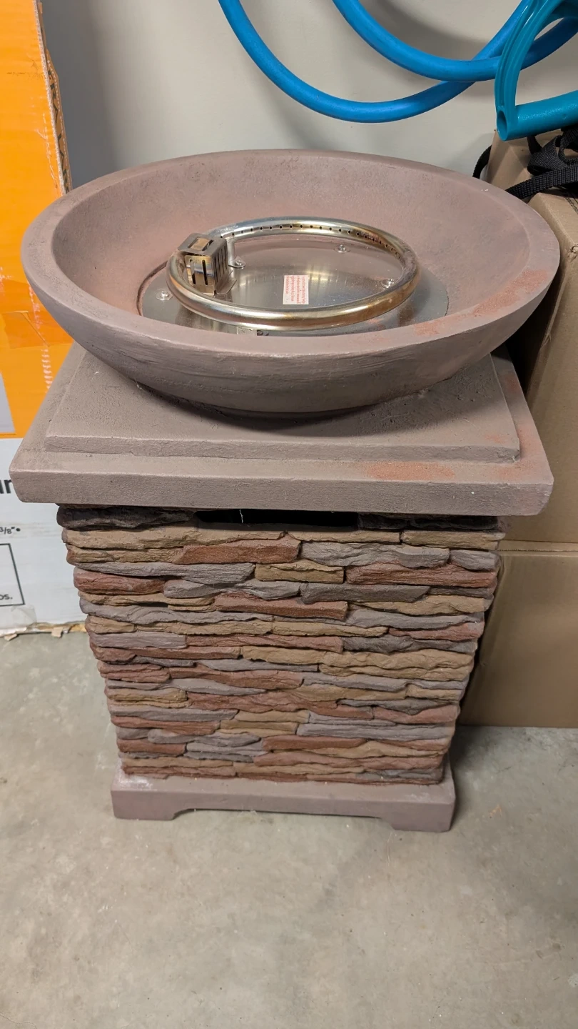 This gas fire pit features a faux stone pedestal base. It's suitable for outdoor use. A propane tank connects to the burner. Have rocks and propane tank. 30inches high, 20inches diameter bowl.