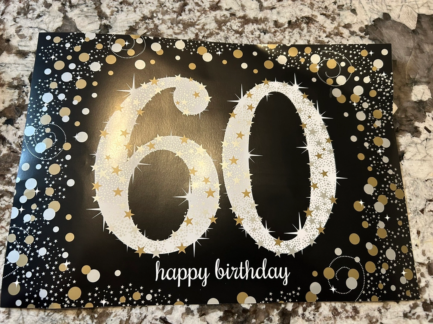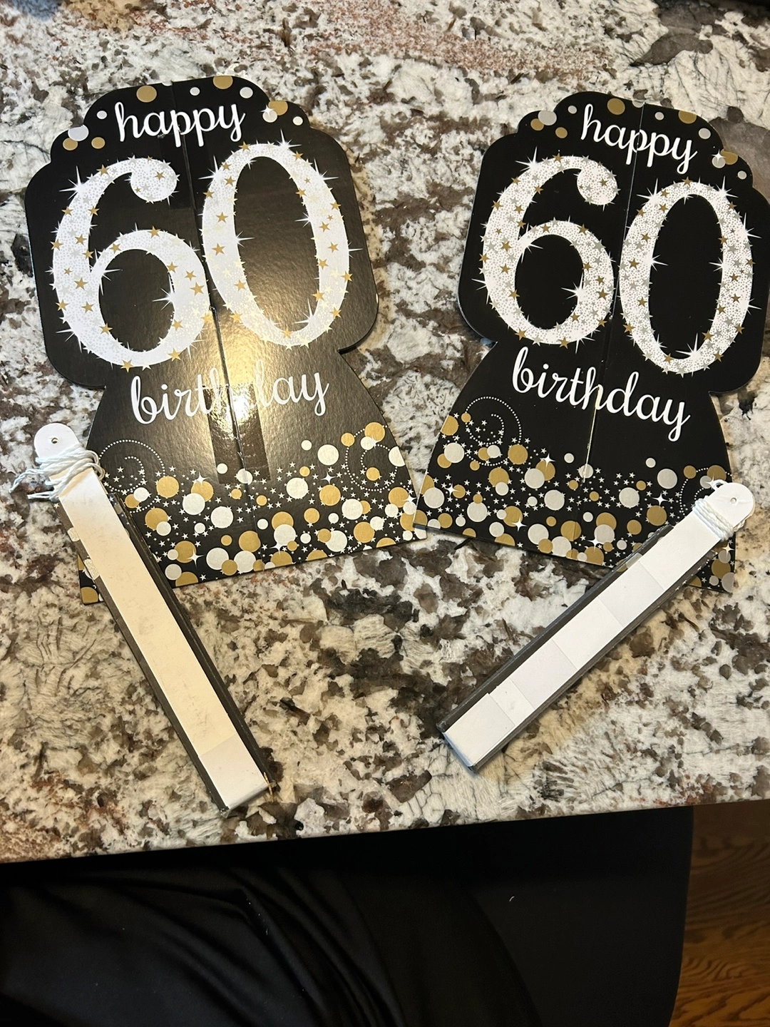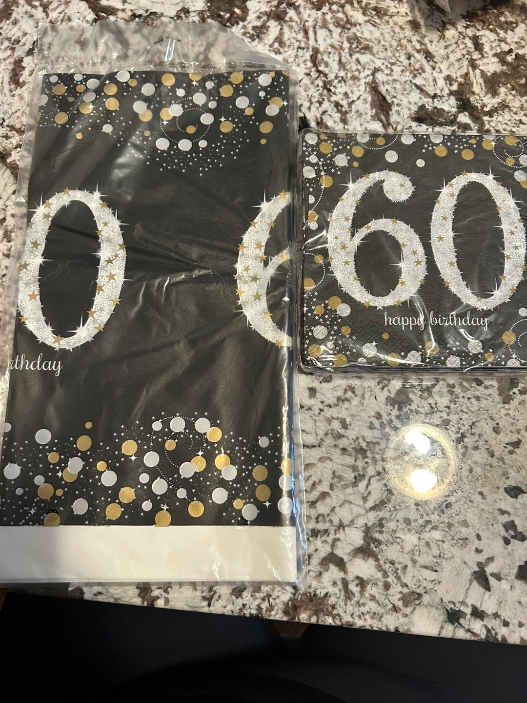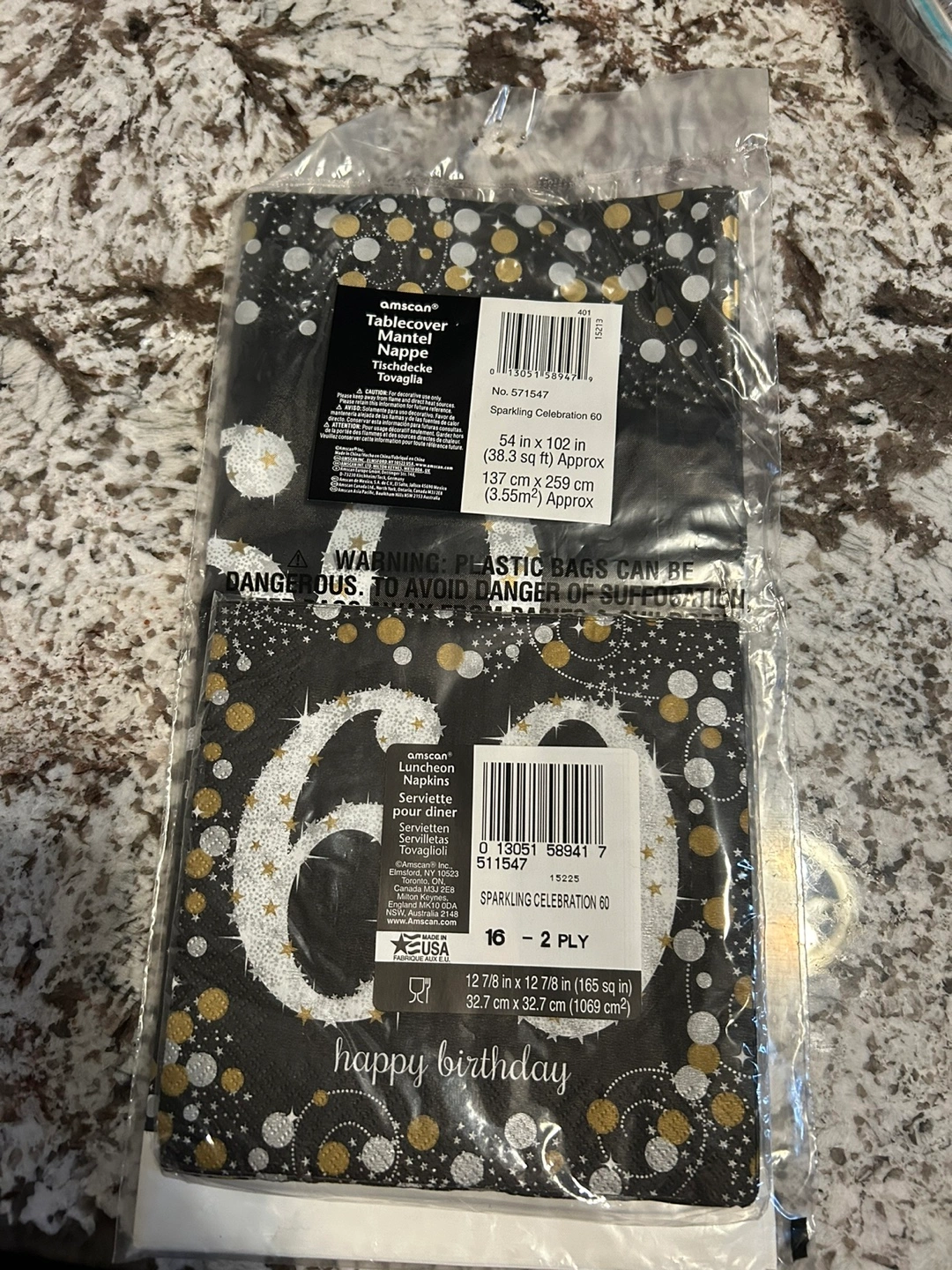 I'm selling a party supply set for a 60th birthday celebration! It includes: - 60 Happy Birthday Cardboard Sheet - 2 x 60 cutouts in silver - 2 x 60th Centrepieces - Amscan Sparkling Celebration 60 Table Cover: 54 in x 102 in (38.3 sq ft) Approx (137 cm x 259 cm) (3.55m) Approx BRAND NEW - Amscan Sparkling Celebration 60 Napkins: 16 - 2 PLY, 12.8 in x 12.8 in (165 sq in) 32.7 cm x 32.7 cm (165 sq cm) BRAND NEW - Happy 60th Birthday Banner All in excellent condition