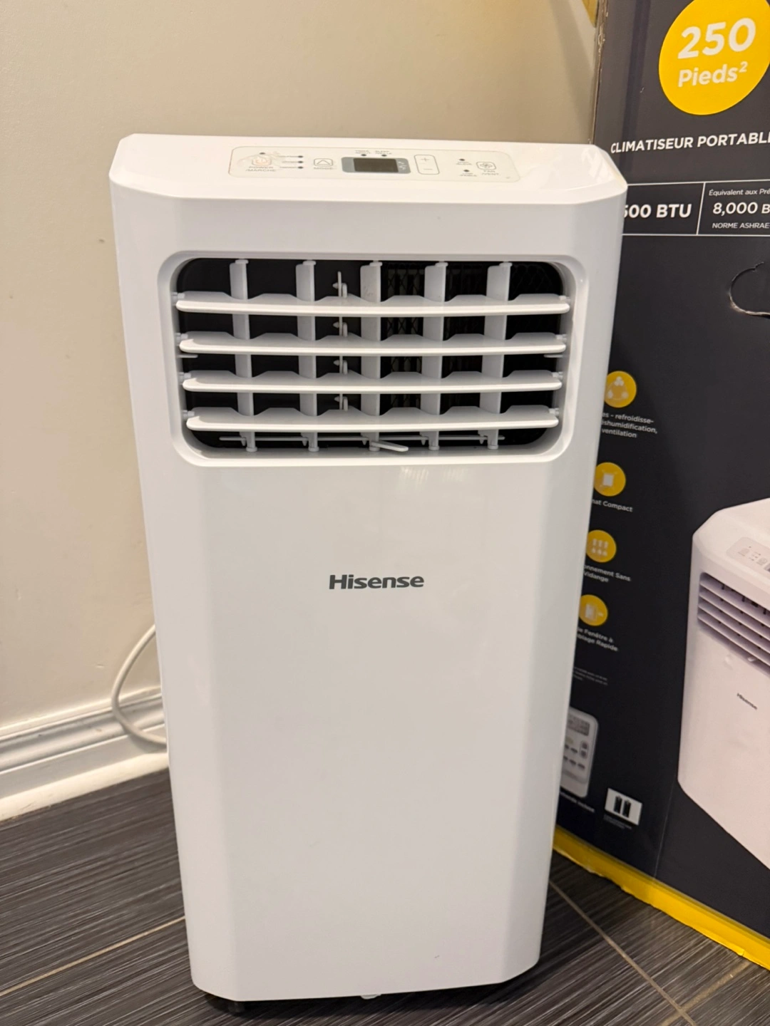 Selling a Hisense portable air conditioner, perfect for cooling spaces up to 250 square feet! It features 5,500 BTU and 8,000 BTU cooling power with 3 modes: refroidissement, déshumidification, and ventilation. This unit is compact and includes a window kit for easy installation. Comes with the original box