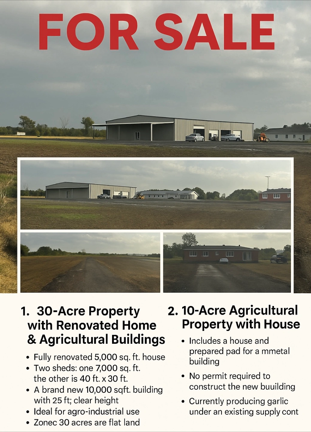 FOR SALE 1. 30-Acre Property with Renovated Home & Agricultural Buildings • Fully renovated 5,000 sq. ft. house • Two sheds: one is 7,000 sq. ft., the other is 40 ft. x 80 ft. • A brand new 10,000 sq. ft. building with 25 ft. clear height and a 1,000 sq. ft. office area • Ideal for agro-industrial use • Entire 30 acres are flat land • Zoned for Bed & Breakfast use 2. 10-Acre Agricultural Property with House • Includes a house and a prepared pad for a metal building • No permit required to construct the new building • Currently producing garlic under an existing supply contract