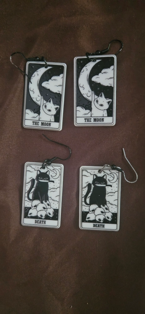 Selling a set of cute and unique tarot card cat earrings! They feature different designs like 'Tarot', 'The Moon', and 'Death'.