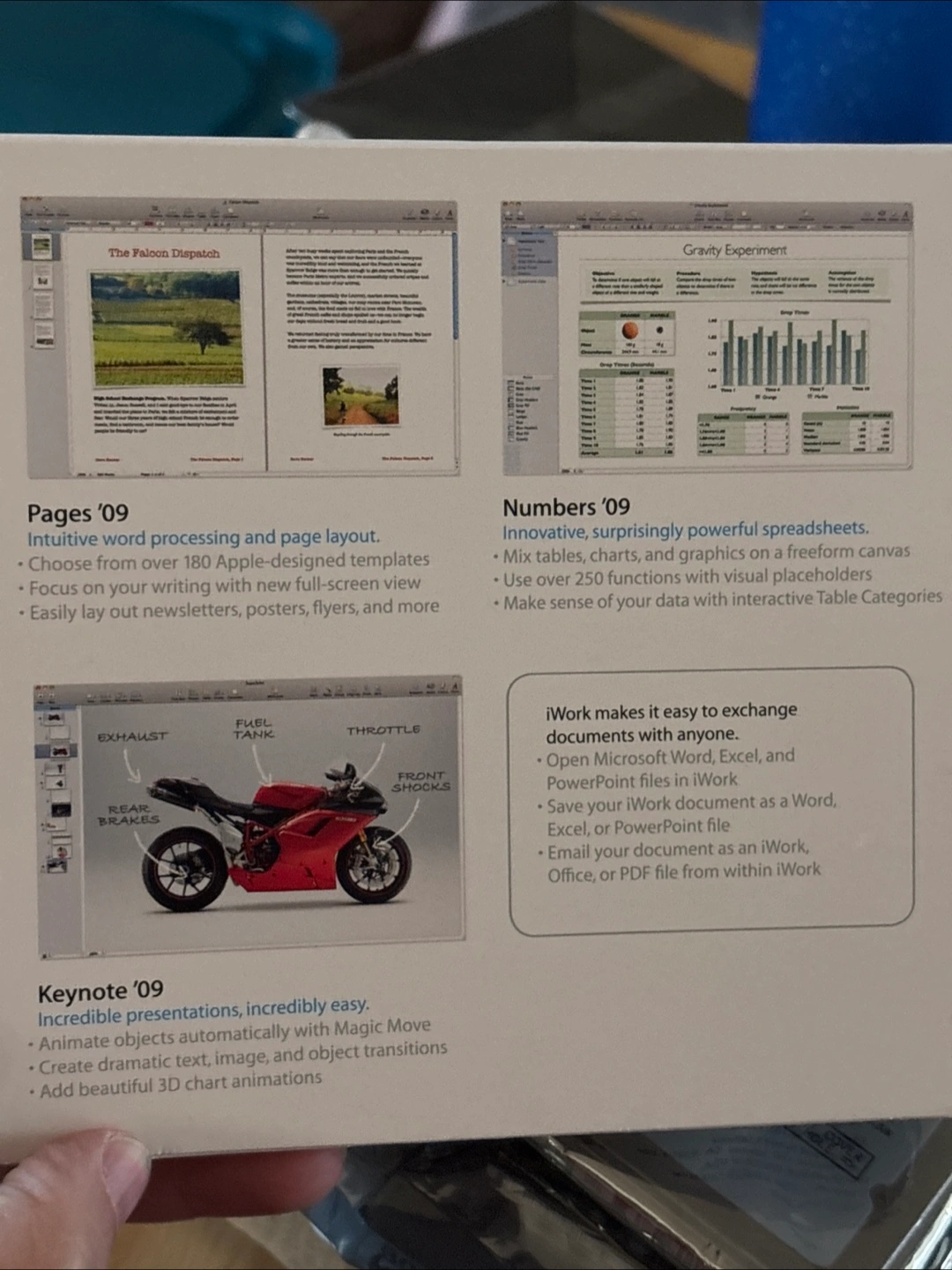 Selling a copy of Apple iWork '09 Retail V9.0.3. It includes Pages, Numbers, and Keynote. iWork makes it easy to exchange documents with anyone, including opening Microsoft Word, Excel, and PowerPoint files