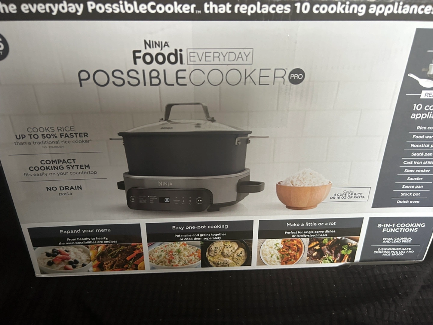 I'm selling a brand new Ninja Foodi PossibleCooker Pro. It's never been used and still in its original packaging! This 6.5 quart cooker replaces 10 cooking appliances and tools. It cooks rice up to 50% faster than a traditional rice cooker. The compact cooking system fits easily on your countertop. It features 8-in-1 cooking functions, including rice cooker, slow cooker, and sauté pan. The box is included!