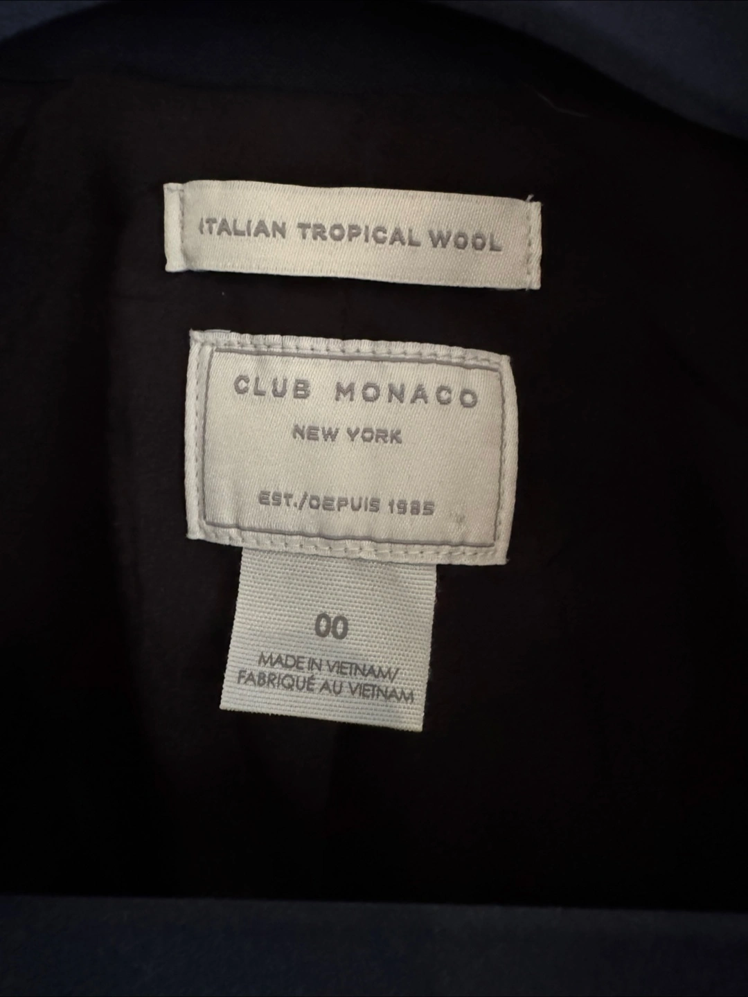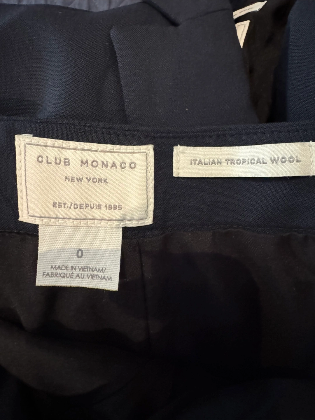 132Worn once. Beautiful for a professional outing. This is a Club Monaco skirt suit made from Italian tropical wool. The skirt is a size 0 and the blazer is a size 00. It's a classic and stylish set! It fits as a XS