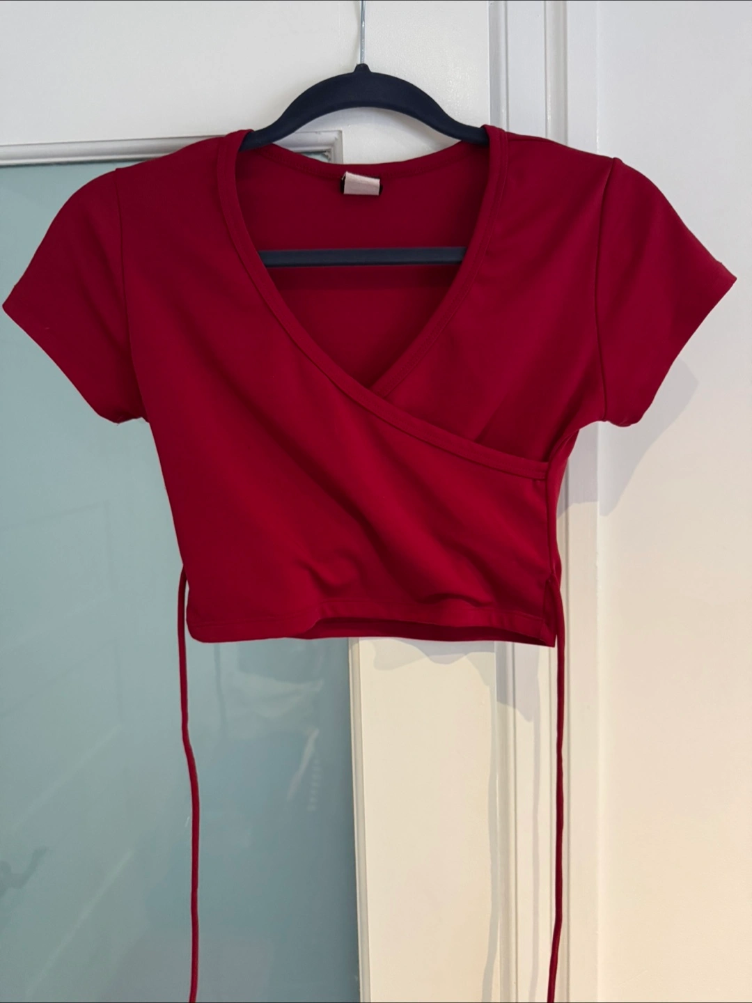 132Selling a cute red wrap crop top from Prima Donna! It's a size small. Great for layering or wearing on its own Very stretchy