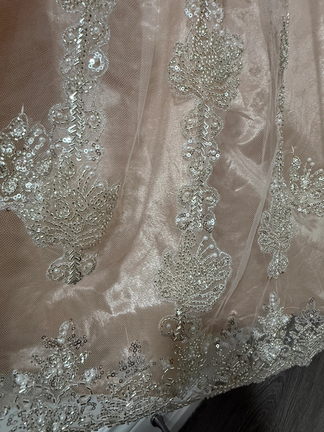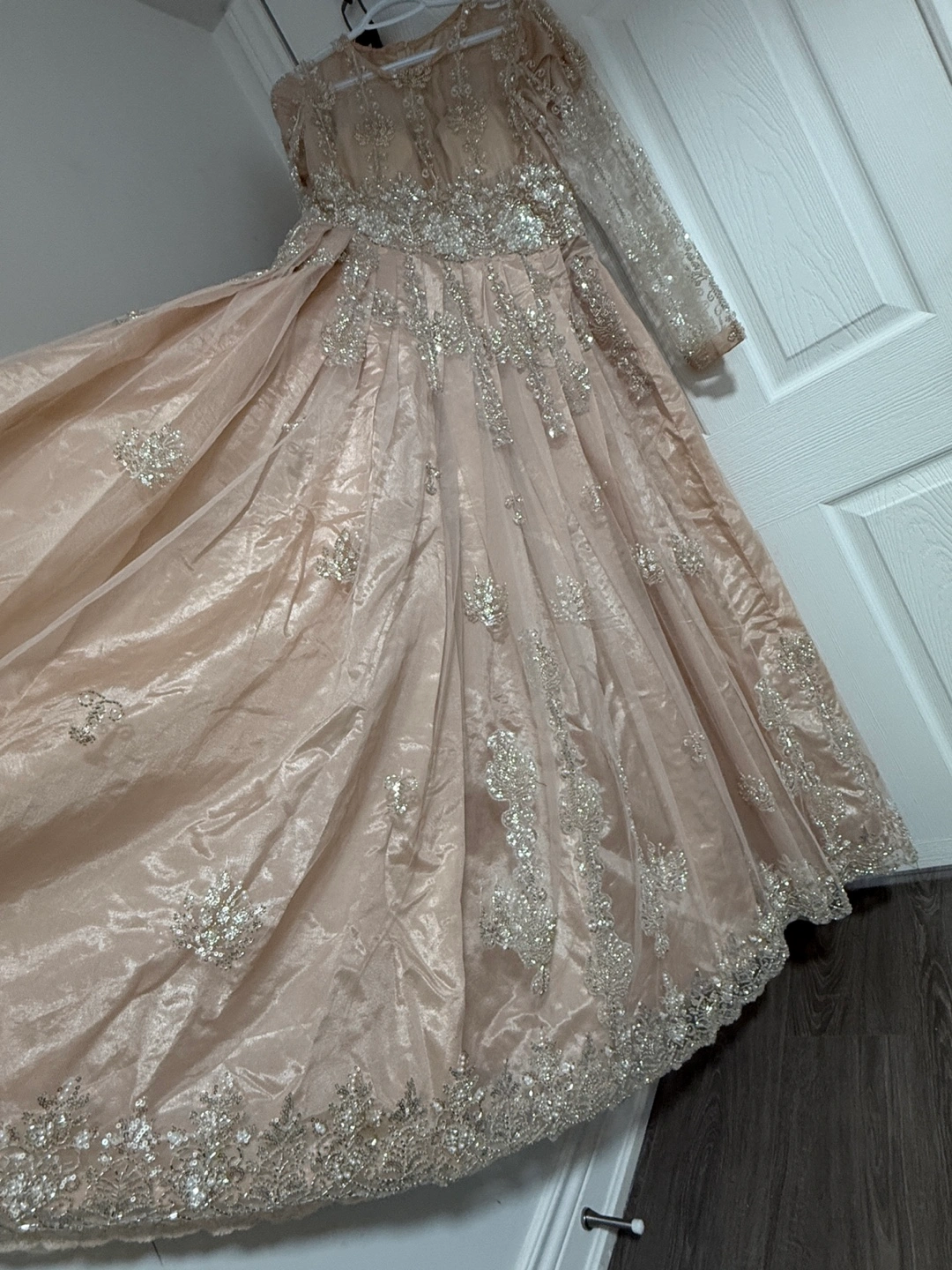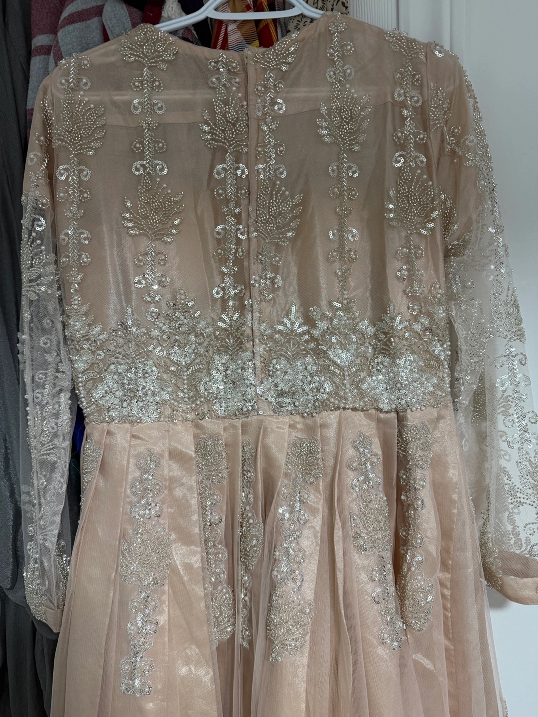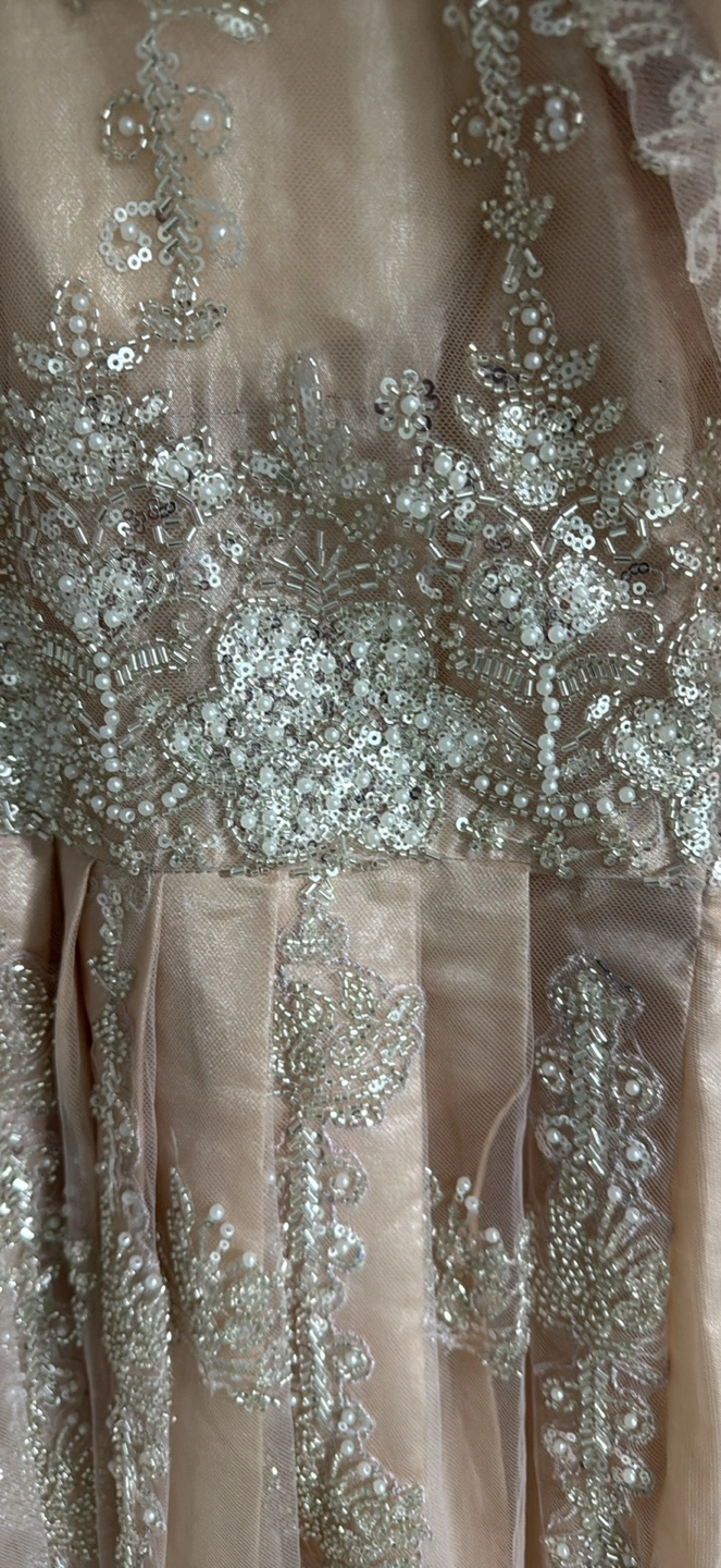 Beautiful formal dress with intricate beading. The dress is a light champagne colour and has long sleeves. Perfect for a special occasion!