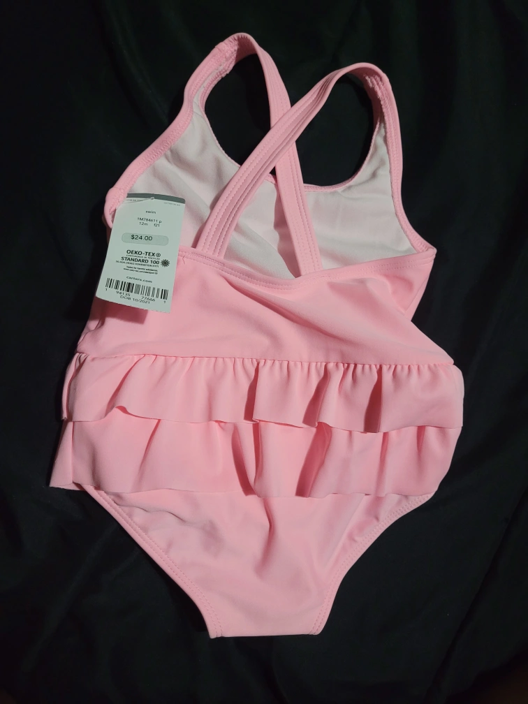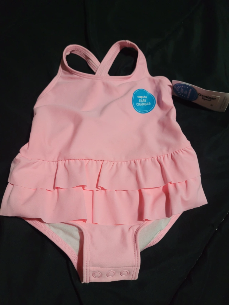 This adorable OshKosh B'gosh swimsuit is brand new with tags! It's a lovely shade of pink and perfect for your little one. It's a size 12 months and has a cute ruffled design.