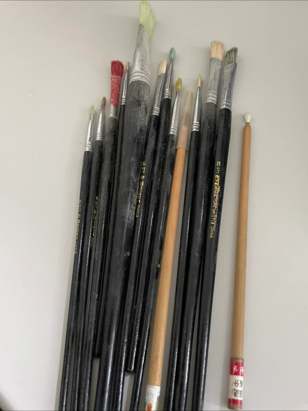 A collection of artist paintbrushes. There's a variety of sizes and bristle types in this lot. Perfect for someone looking to expand their art supplies!