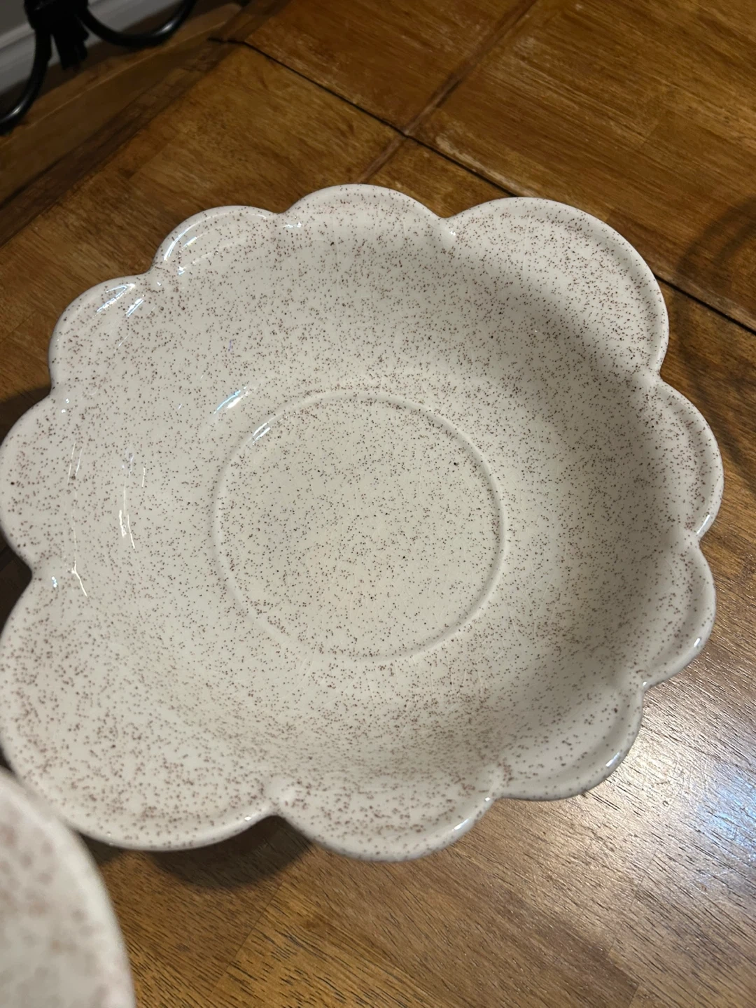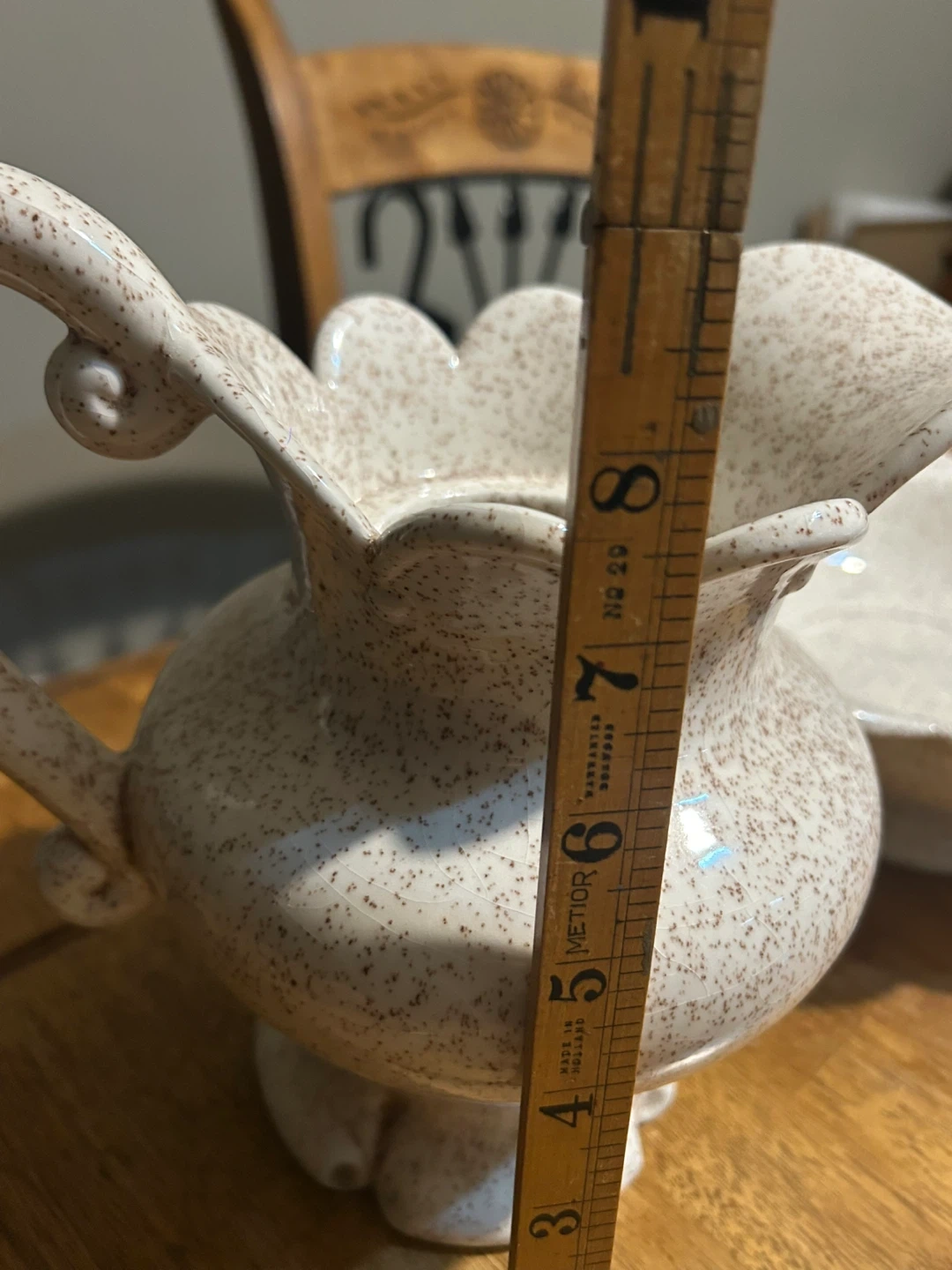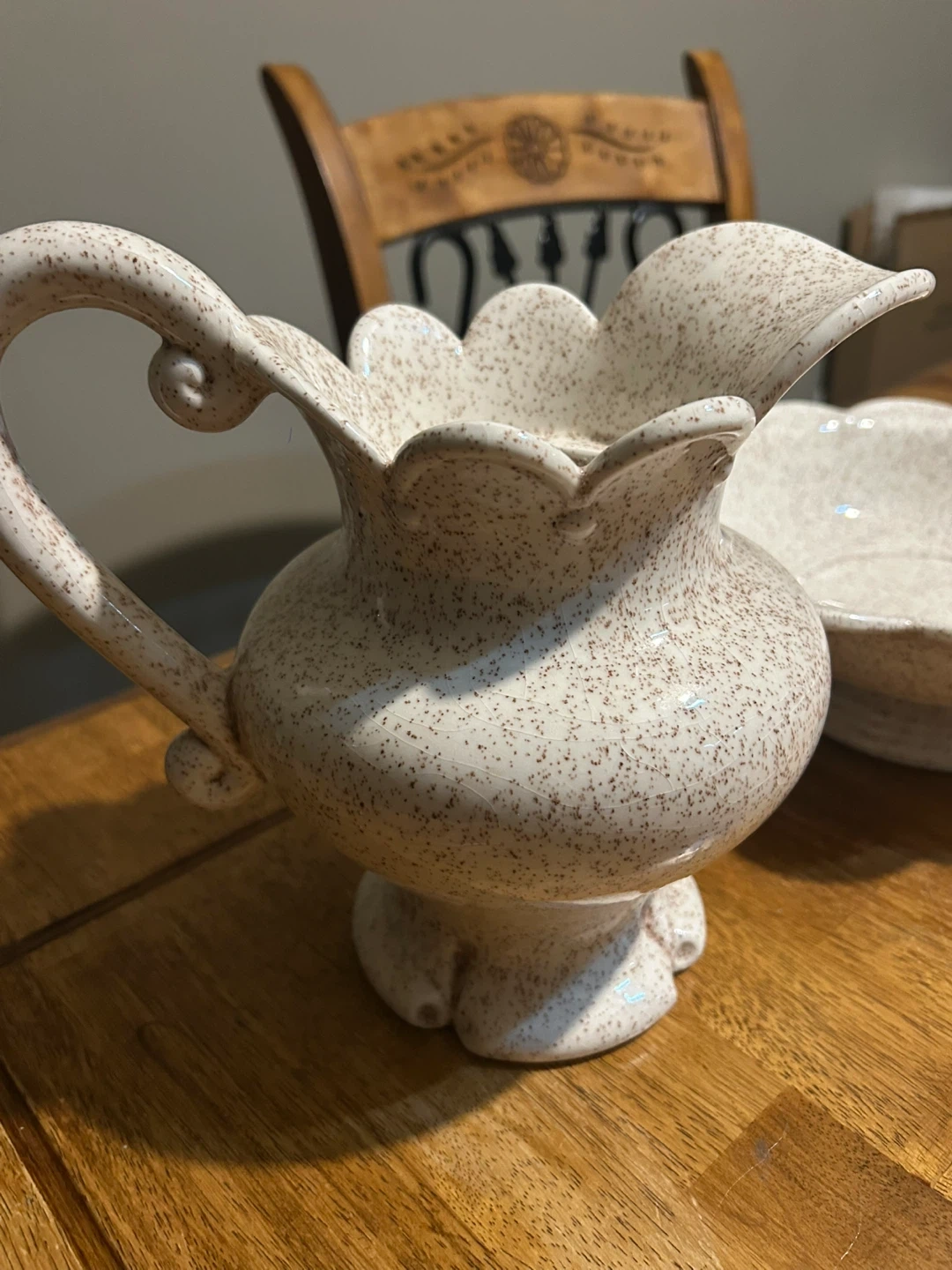 Vintage ceramic pitcher and wash bowl set with a speckled design. The pitcher stands approximately 8 inches tall and the bowl has a diameter of about 11 inches. It's a classic wash basin set.