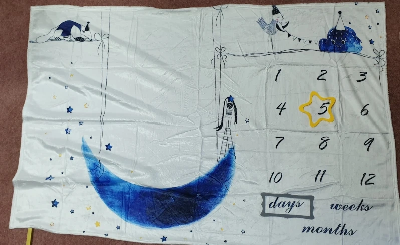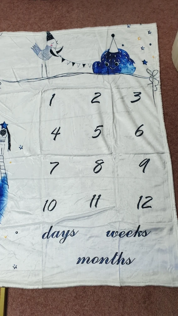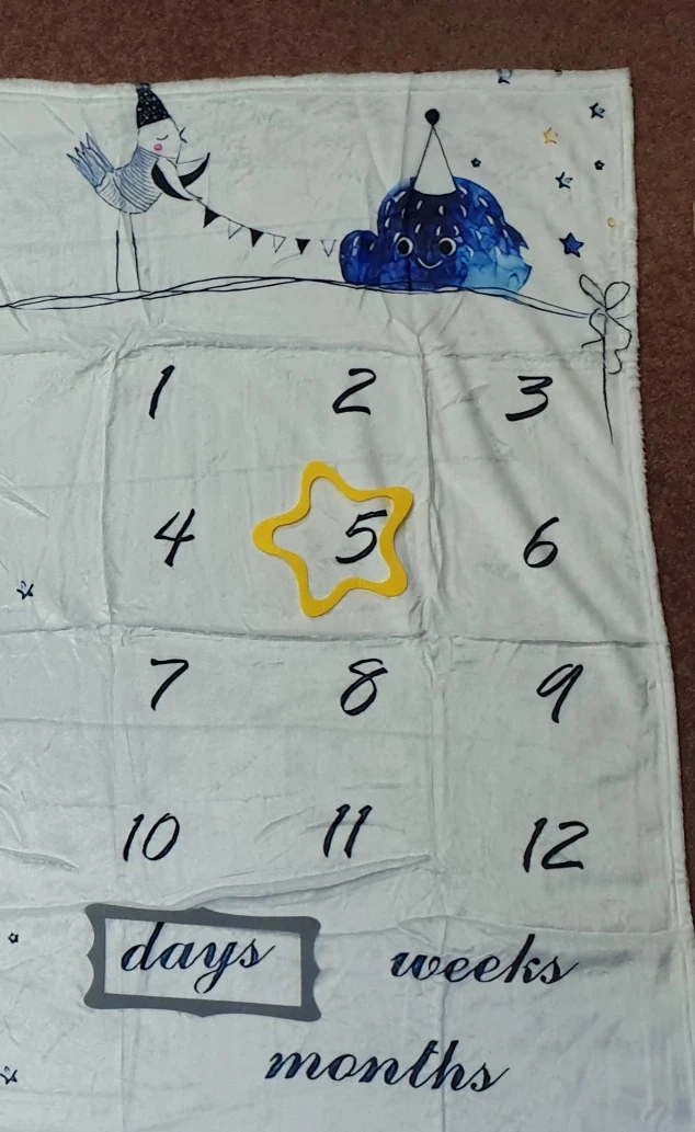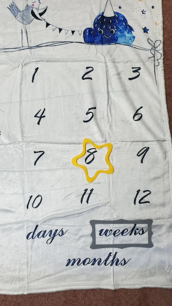 New, Opened to take pictures for the ad. I'm selling a baby milestone blanket, perfect for tracking your little one's growth! It has numbers 1-12, labelled for days, weeks, and months. Comes with a star-shaped marker to highlight the current milestone. It's in great condition and ready for a new home! Cash only please.