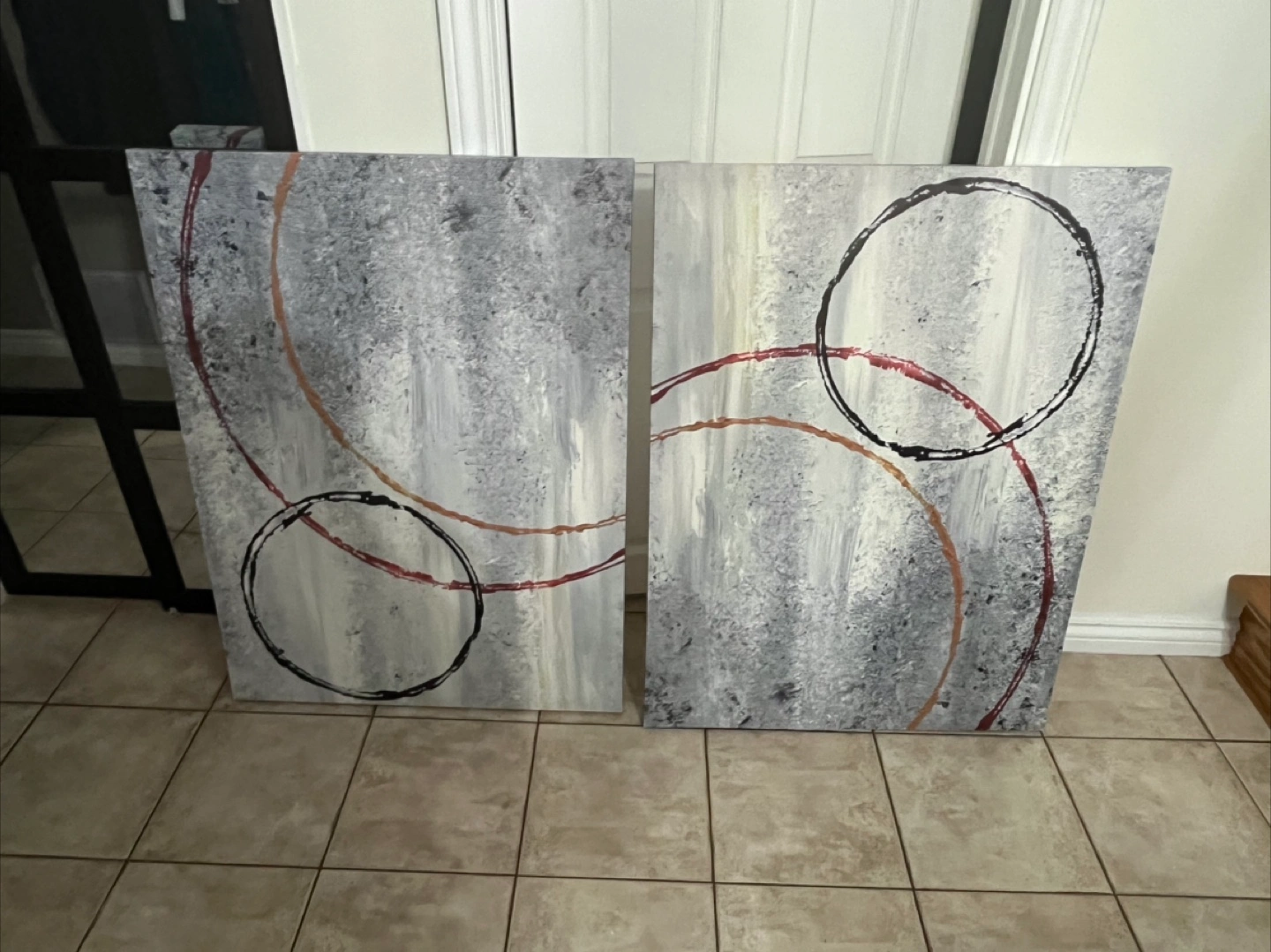 Selling 3 pcs abstract wall art pieces! They feature a modern design with overlapping circles in black, red, and brown tones against a textured grey and white background. These canvases would add a stylish touch to any room.