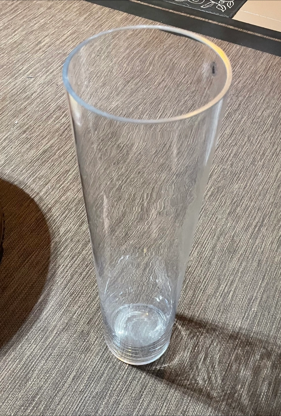 Selling a 26” tall, straight sided clear glass vase, perfect for displaying your favourite flowers or greenery! It's in great condition and perfect for Christmas balls & mini lights.
