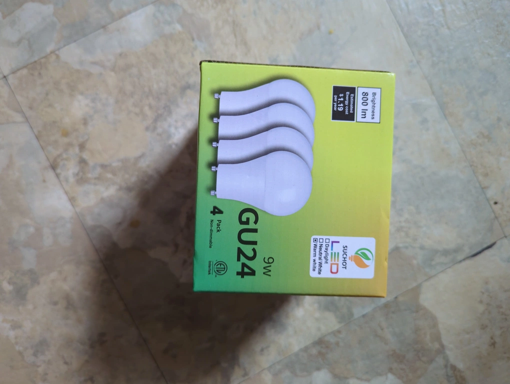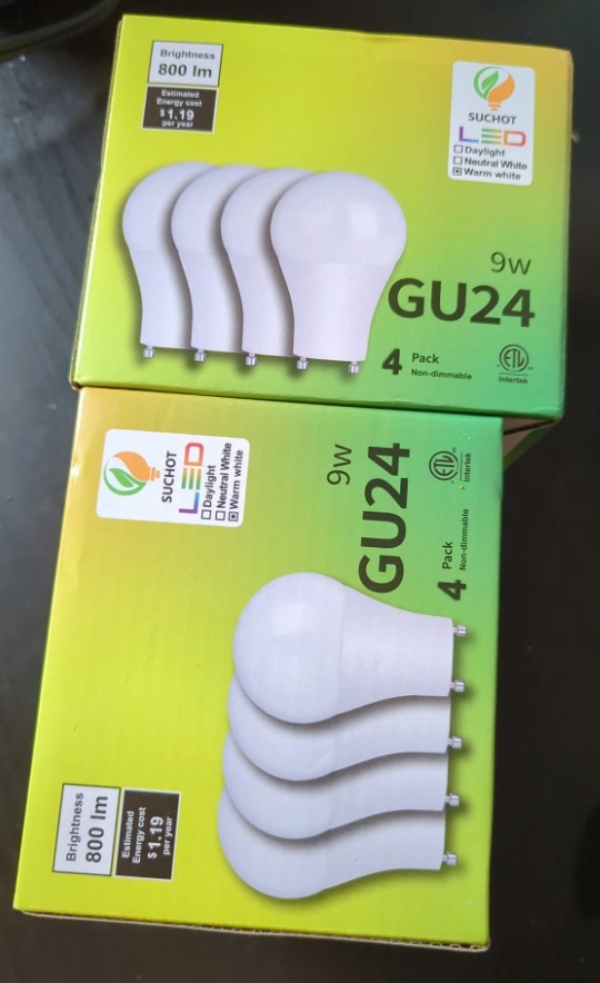 Selling two packs of SUCHOT LED light bulbs. Each pack contains 4 non-dimmable GU24 9W bulbs. They provide 800lm brightness and are available in daylight, neutral white, and warm white options $5 each