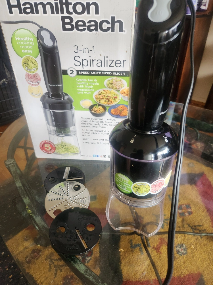 I'm selling a Hamilton Beach 3-in-1 Spiralizer! It's a speed motorized slicer that helps you create fun and healthy meals with fresh vegetables and fruits. It can create zucchini noodles, vegetable salad, cucumber spirals, apple spirals, and more. It includes spiral cutter, ribbon cutter, and grater. It's easy to use and clean with an extra-long 5 ft cord. Box included!