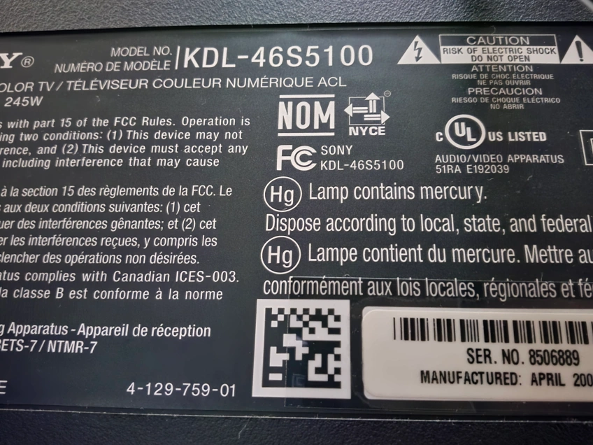 Selling a Sony BRAVIA 46-inch LCD TV, model number KDL-46S5100. It's in good working condition and ready for a new home!