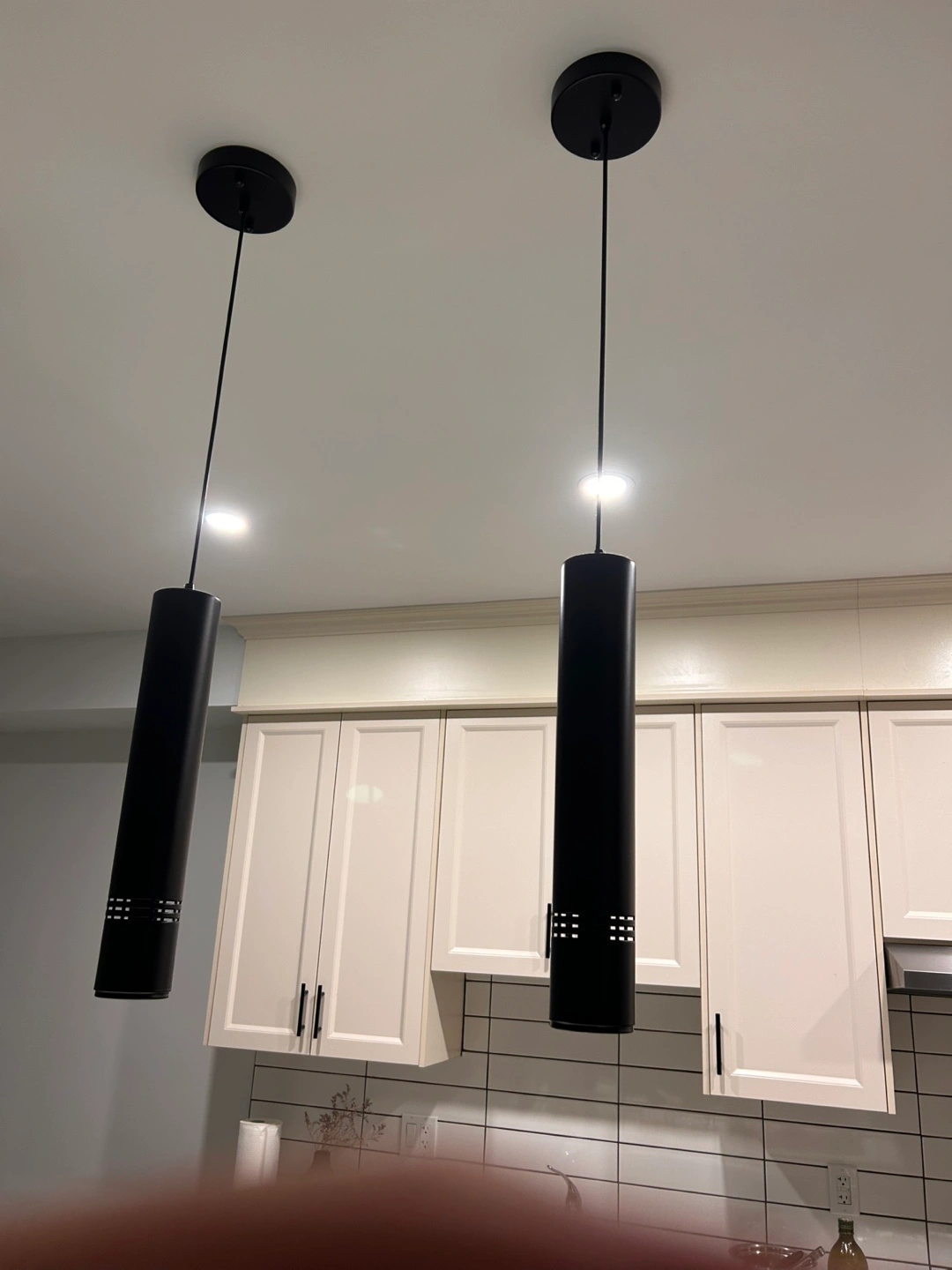 Selling 2 pcs of sleek black cylinder pendant lights. They're in great shape and would look fantastic over a kitchen island or dining area. Adds a modern touch to any space! $ 20each