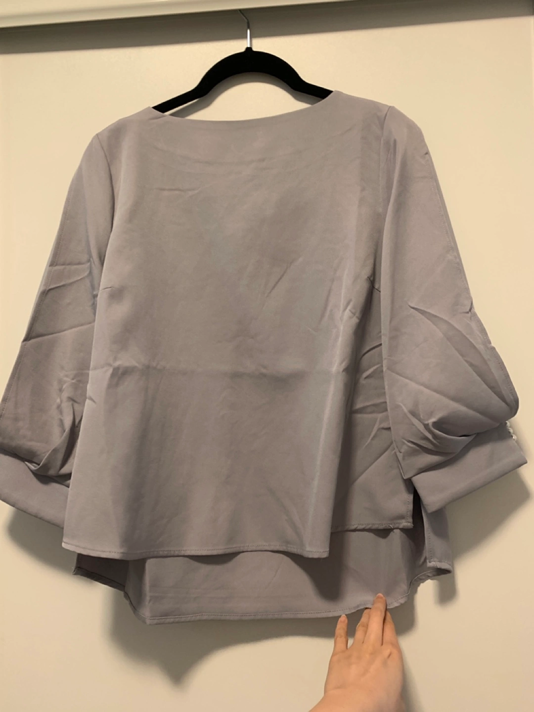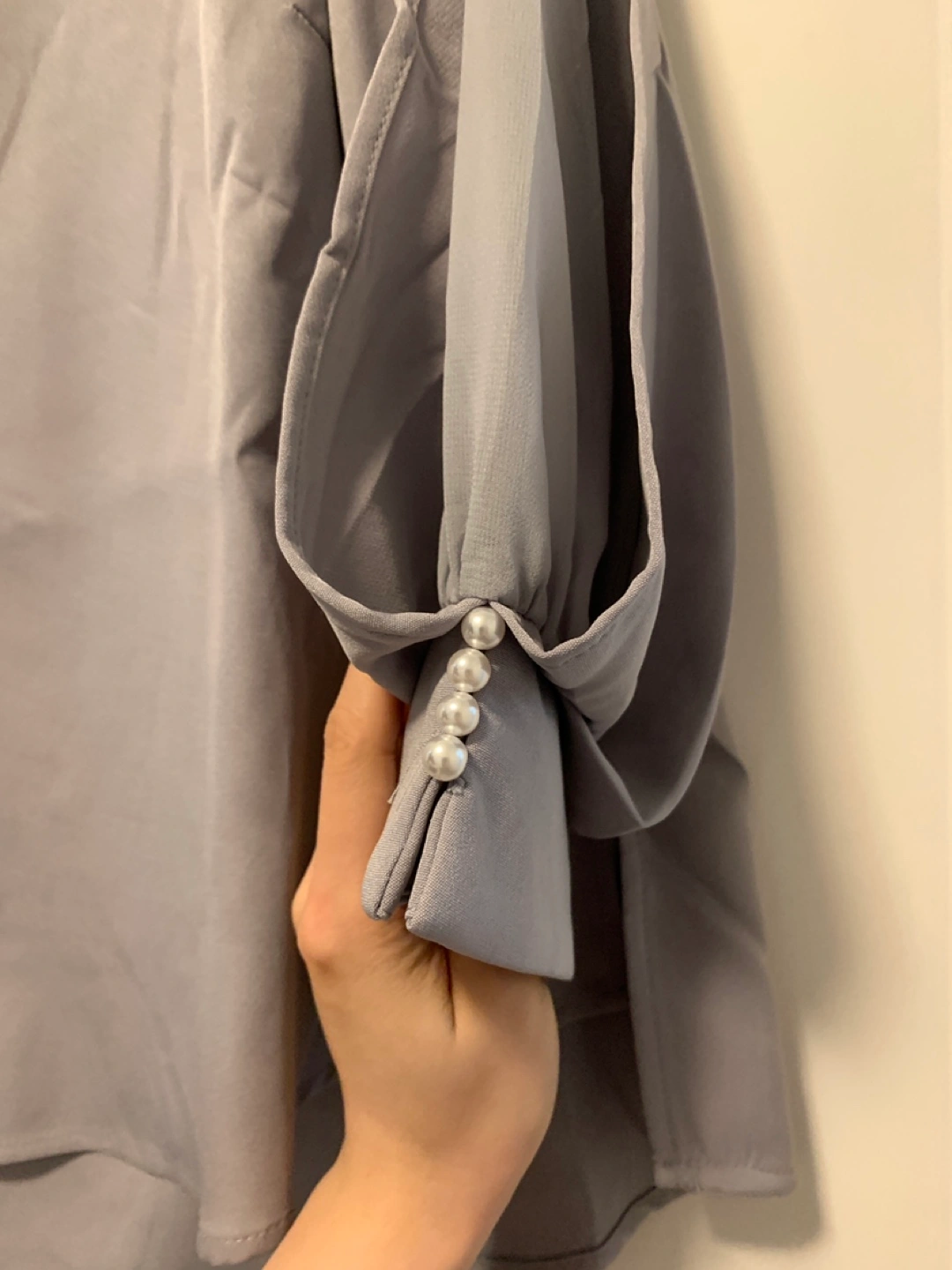 343Selling a lovely grey long sleeve blouse. It features a unique design with pearl detailing on the sleeves. Perfect for adding a touch of elegance to your wardrobe!