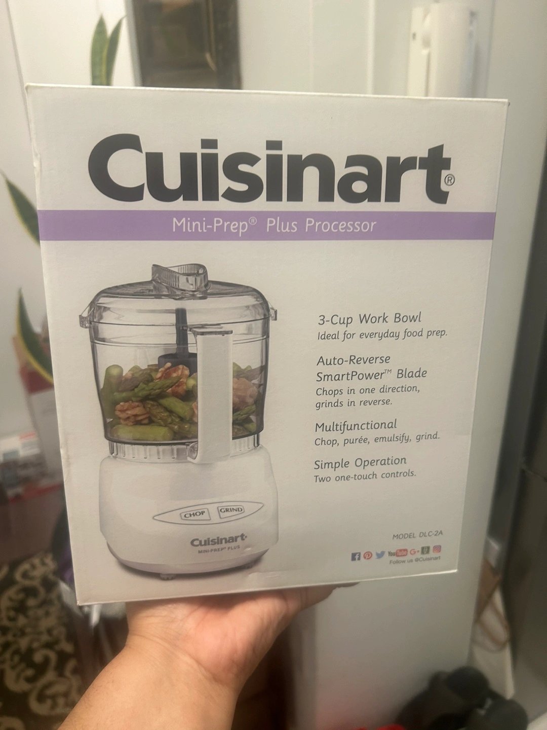 I'm selling a Cuisinart Mini-Prep Plus Processor. It features a 3-cup work bowl ideal for everyday food prep. It's multifunctional for chopping, pureeing, emulsifying, and grinding. The SmartPower blade chops in one direction and grinds in reverse. It's designed for simple operation with two one-touch controls. The model number is DLC-2A. It is widely selling online for $50. This is brand new never opened in original box.