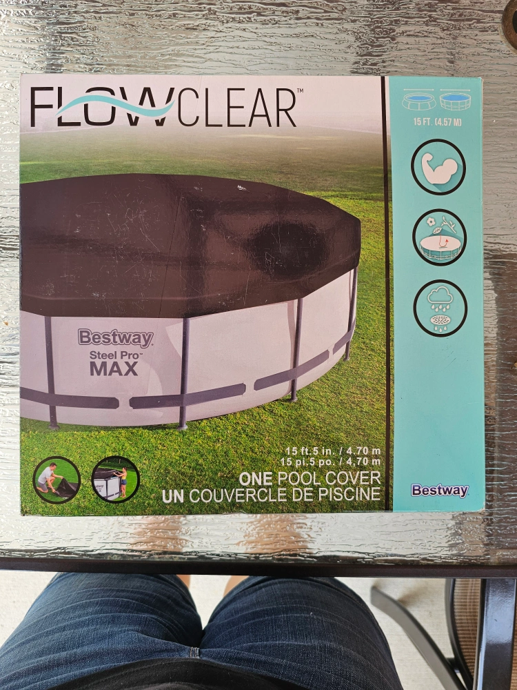 192Selling a brand new Flowclear Bestway Steel Pro MAX pool cover! It fits a 15 ft (4.57 m) pool and helps to secure your pool and keep it clean. Never been used and still in the original packaging. Never opened. Never used.