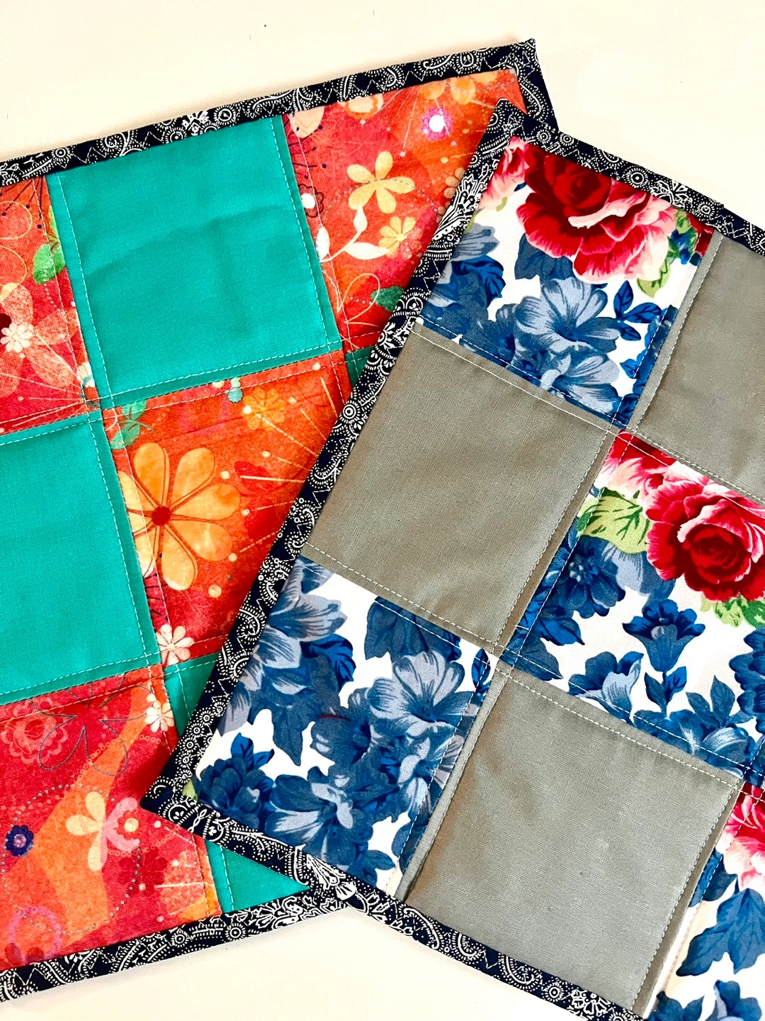I'm selling a set of two handmade quilted placemats. One has a vibrant floral pattern with teal squares, and the other features a blue and red floral design with grey squares. They're perfect for adding a touch of handmade charm to your dining table!