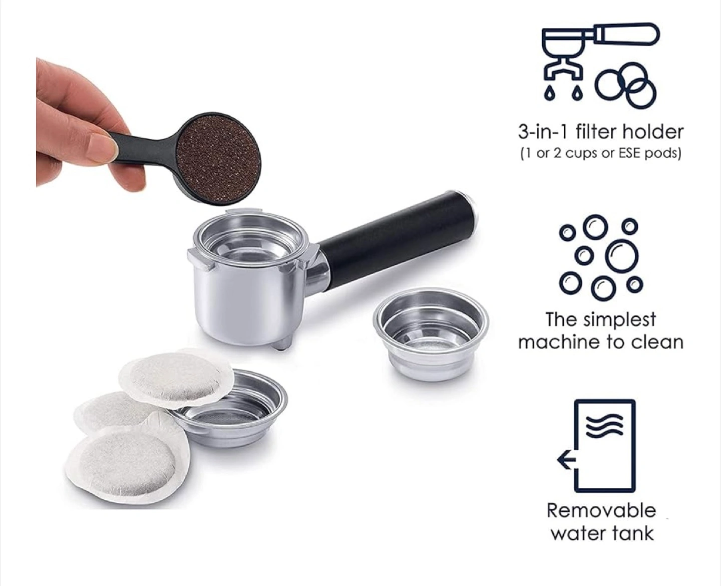 Selling a DeLonghi espresso and cappuccino machine. It features a 15-bar professional pressure system for authentic Italian espresso. It also has a 3-in-1 filter holder and a removable water tank, making it simple to clean!