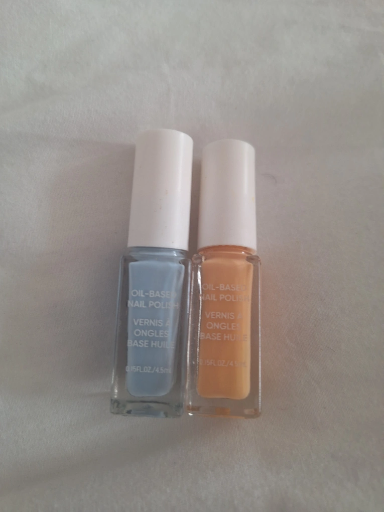 Two bottles of oil-based nail polish for sale! They are slightly used but still very good. One is a lovely peach colour, and the other is a soft blue. Each bottle contains 0.15fl oz/4.5mL