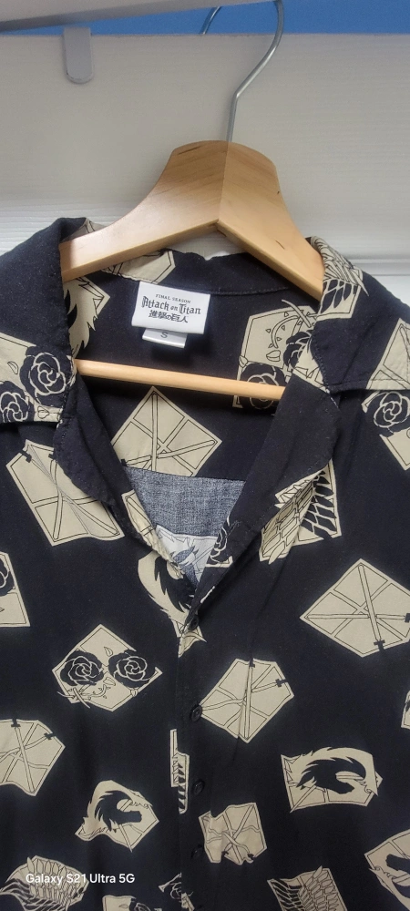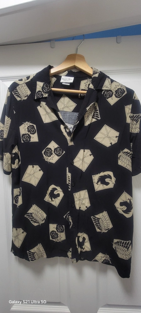 Here's a cool Attack on Titan button-up shirt! It features a unique design with symbols and patterns from the popular anime series. Perfect for fans of the show!