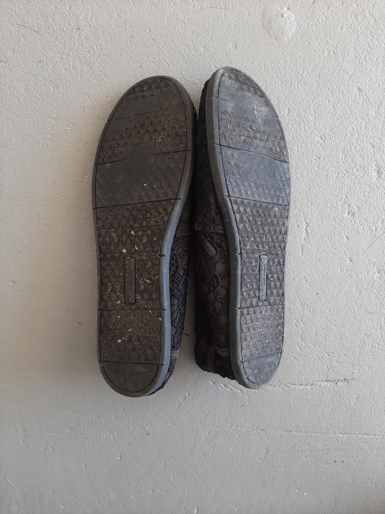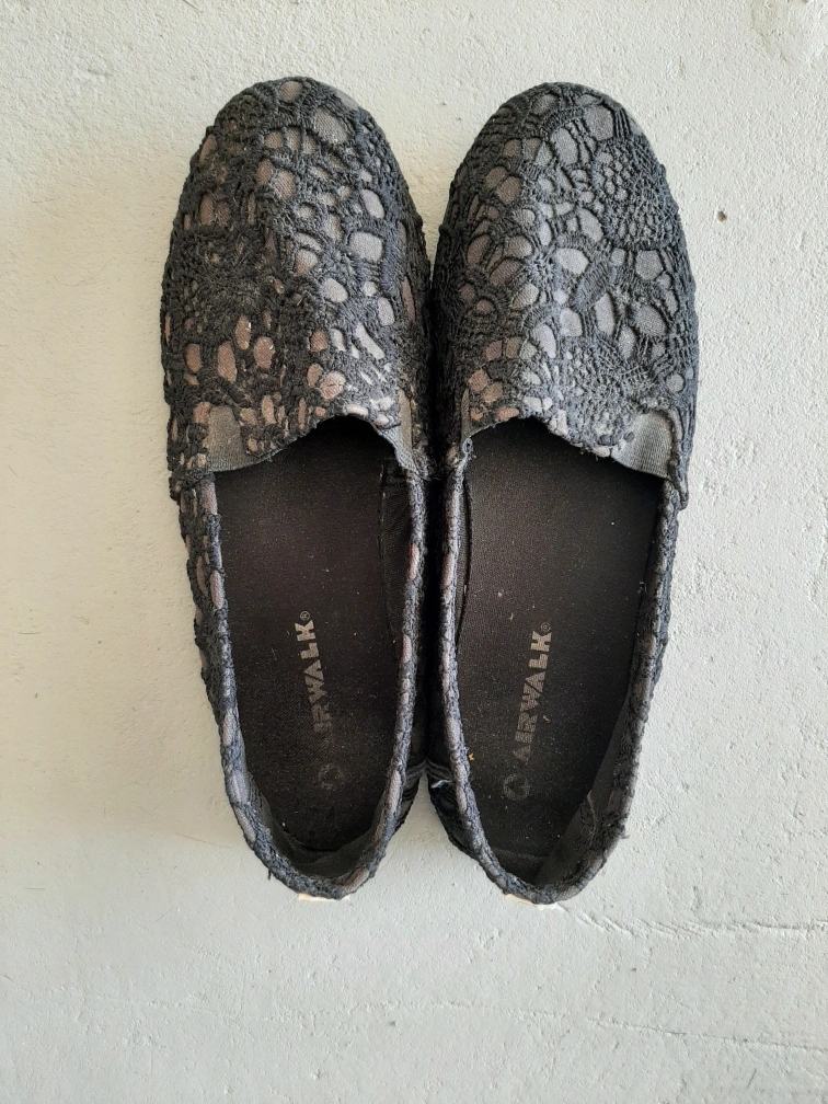 Selling a pair of Airwalk slip-on shoes. They are black with a lace pattern on the upper part of the shoe. They show some signs of wear on the soles, but still have lots of life left!