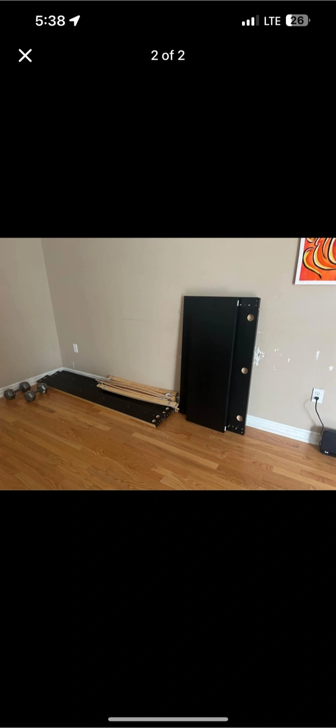 Selling a black bed frame. It's in good condition and comes with all the necessary parts for assembly. Perfect for a bedroom upgrade!