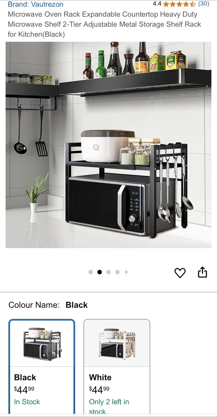 Looking to free up some counter space? This Vautrezon microwave oven rack is the perfect solution! It's a 2-tier adjustable metal storage shelf rack designed for the kitchen. The colour is black.