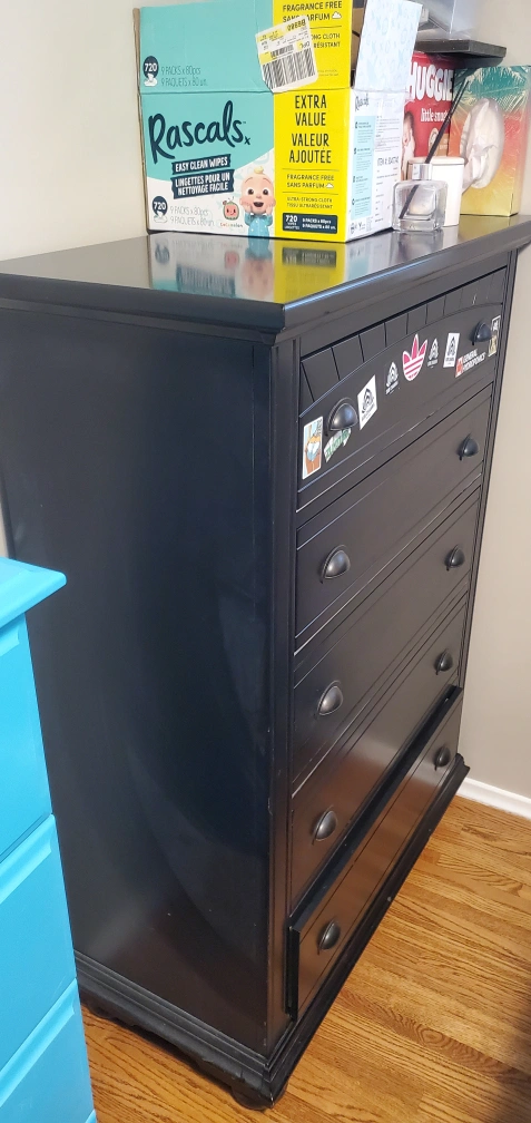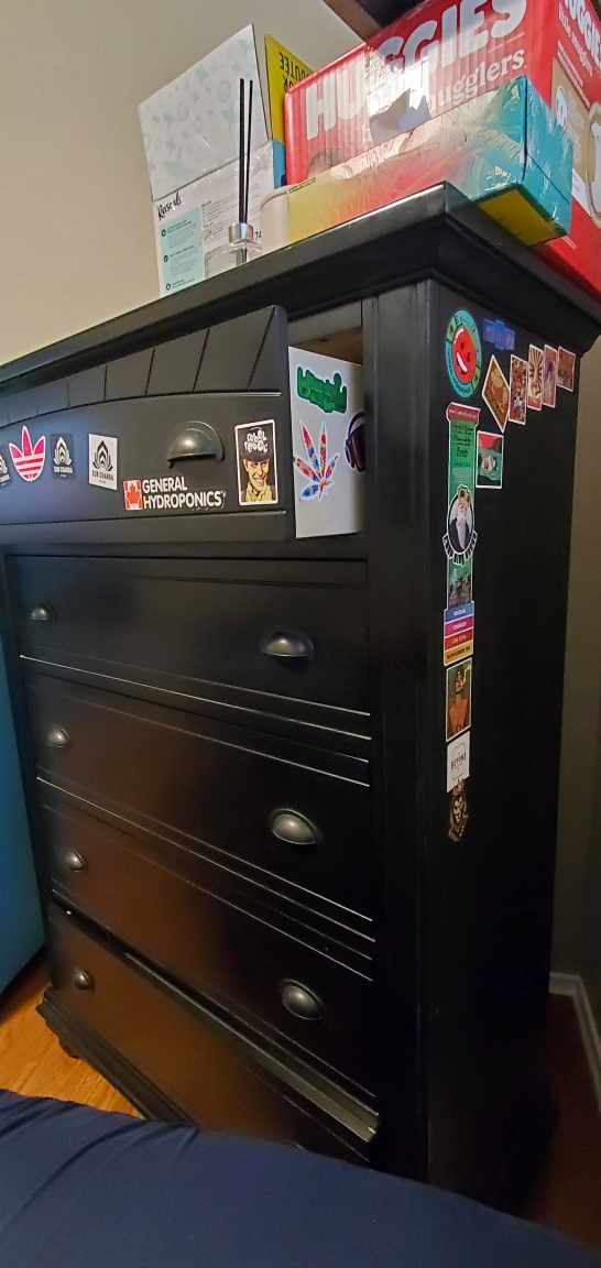 Great condition! All drawers work well, one of them is a bit squeaky. Very few nicks or scratches. Stickers on the front and side. 52.5" x 37" x 17.5"
